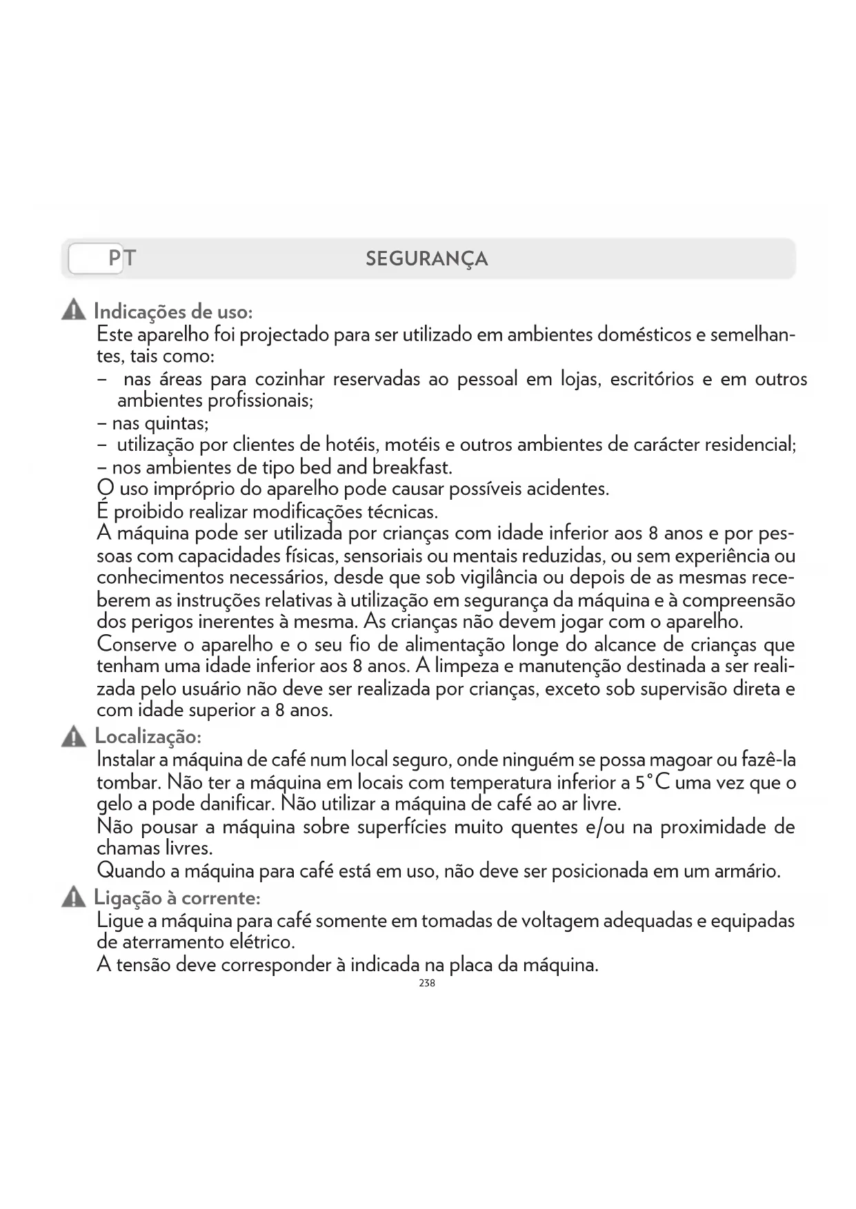CLIENTES LAVAZZA.238 ITPT SEGURANÇA Indicações de uso: Este aparelho foi projectado para ser utilizado em ambientes domésticos e semelhan- tes, tais como: – nas áreas para cozinhar reservadas ao pessoal em lojas, escritórios e em outros ambientes profissionais; – nas quintas; – utilização por clientes de hotéis, motéis e outros ambientes de carácter residencial; – nos ambientes de tipo bed and breakfast. O uso impróprio do aparelho pode causar possíveis acidentes. É proibido realizar modificações técnicas. A máquina pode ser utilizada por crianças com idade inferior aos 8 anos e por pes- soas com capacidades físicas, sensoriais ou mentais reduzidas, ou sem experiência ou conhecimentos necessários, desde que sob vigilância ou depois de as mesmas rece- berem as instruções relativas à utilização em segurança da máquina e à compreensão dos perigos inerentes à mesma. As crianças não devem jogar com o aparelho. Conserve o aparelho e o seu fio de alimentação longe do alcance de crianças que tenham uma idade inferior aos 8 anos. A limpeza e manutenção destinada a ser reali- zada pelo usuário não deve ser realizada por crianças, exceto sob supervisão direta e com idade superior a 8 anos. Localização: Instalar a máquina de café num local seguro, onde ninguém se possa magoar ou fazê-la tombar. Não ter a máquina em locais com temperatura inferior a 5°C uma vez que o gelo a pode danificar. Não utilizar a máquina de café ao ar livre. Não pousar a máquina sobre superfícies muito quentes e/ou na proximidade de chamas livres. Quando a máquina para café está em uso, não deve ser posicionada em um armário. Ligação à corrente: Ligue a máquina para café somente em tomadas de voltagem adequadas e equipadas de aterramento elétrico. A tensão deve corresponder à indicada na placa da máquina.239