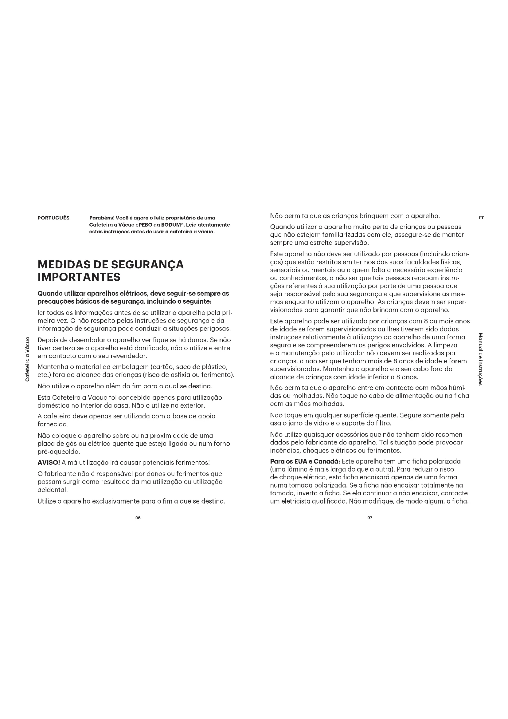 meira vez. O não respeito pelas instruções de segurança e da informação de segurança pode conduzir a situações perigosas. Depois de desembalar o aparelho veriique se há danos. Se não tiver certeza se o aparelho está daniicado, não o utilize e entre em contacto com o seu revendedor. Mantenha o material da embalagem (cartão, saco de plástico, etc.) fora do alcance das crianças (risco de asixia ou ferimento). Não utilize o aparelho além do im para o qual se destina. Esta Cafeteira a Vácuo foi concebida apenas para utilização doméstica no interior da casa. Não o utilize no exterior. A cafeteira deve apenas ser utilizada com a base de apoio fornecida. Não coloque o aparelho sobre ou na proximidade de uma placa de gás ou elétrica quente que esteja ligada ou num forno pré-aquecido. AVISO! A má utilização irá causar potenciais ferimentos! O fabricante não é responsável por danos ou ferimentos que possam surgir como resultado da má utilização ou utilização acidental. Utilize o aparelho exclusivamente para o im a que se destina. Parabéns! Você é agora o feliz proprietário de uma Cafeteira a Vácuo ePEBO da BODUM®. Leia atentamente estas instruções antes de usar a cafeteira a vácuo. PORTUGUÊS
