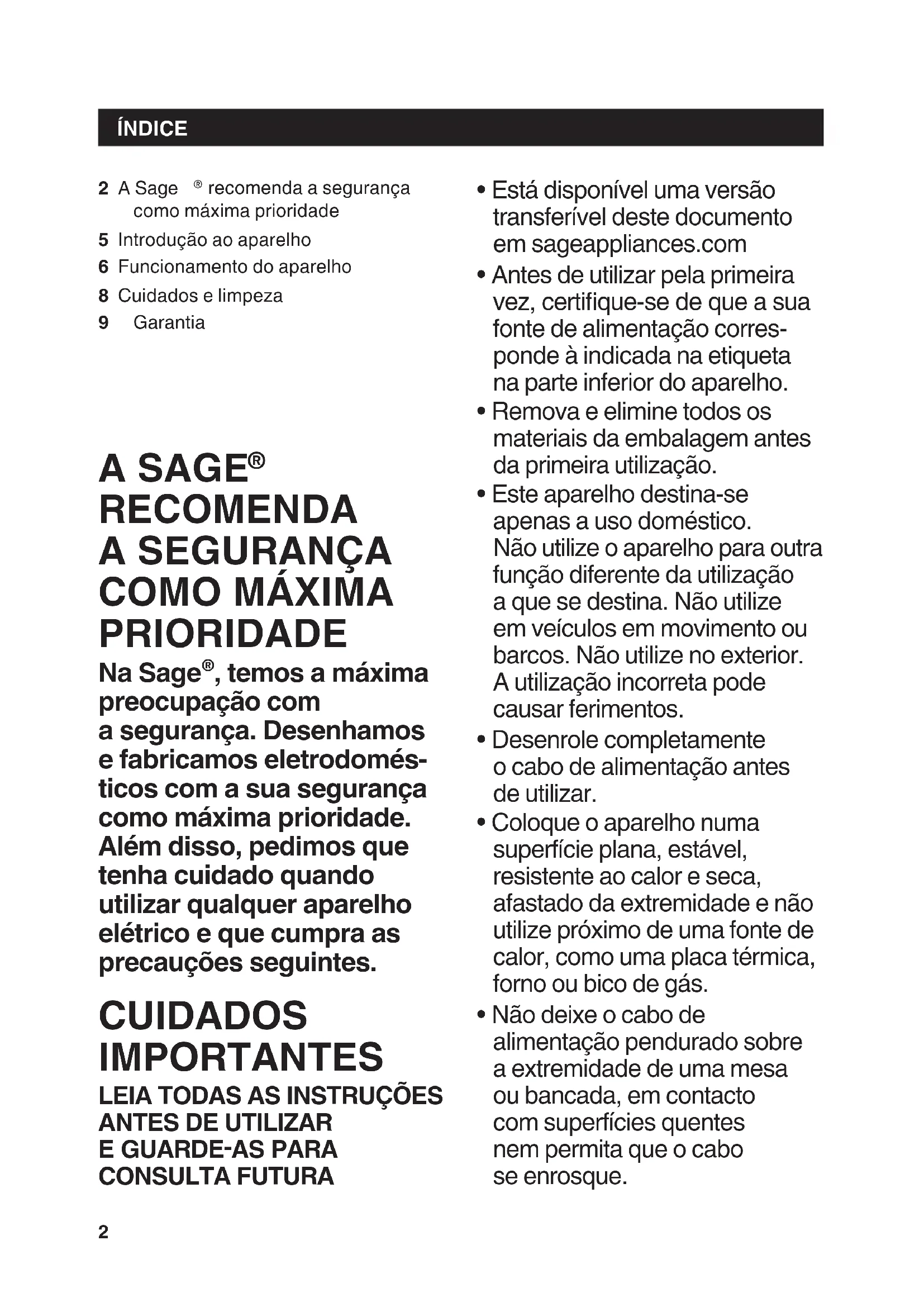 CONSULTA FUTURA 2 A Sage recomenda a segurança como máxima prioridade5 Introdução ao aparelho6 Funcionamento do aparelho8 Cuidados e limpeza9 Garantia3