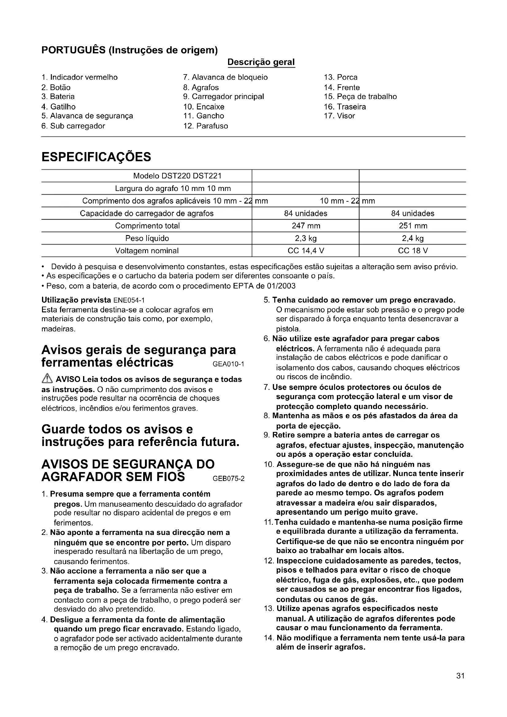 - Peso, com a bateria, de acordo com o procedimento EPTA de 01/2003 Utilização prevista ENE054-1 Esta ferramenta destina-se a colocar agrafos em materiais de construção tais como, por exemplo, madeiras. Avisos gerais de segurança para ferramentas eléctricas GEA010-1 AVISO Leia todos os avisos de segurança e todas as instruções. O não cumprimento dos avisos e instruções pode resultar na ocorrência de choques eléctricos, incêndios e/ou ferimentos graves. Guarde todos os avisos e instruções para referência futura.