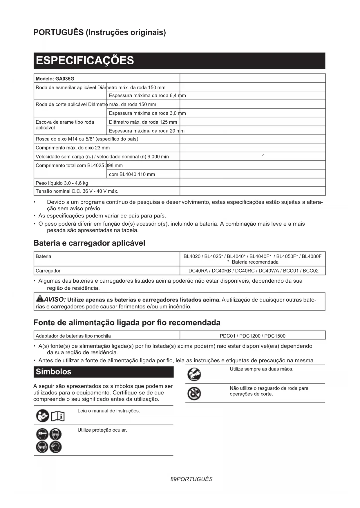 - Antes de utilizar a fonte de alimentação ligada por o, leia as instruções e etiquetas de precaução na mesma. Símbolos A seguir são apresentados os símbolos que podem ser utilizados para o equipamento. Certique-se de que compreende o seu signicado antes da utilização. Leia o manual de instruções. Utilize proteção ocular. Utilize sempre as duas mãos. Não utilize o resguardo da roda para operações de corte.90 PORTUGUÊS Ni-MH Li-ion Apenas para países da UE Devido à presença de componentes perigosos no equipamento, os resíduos de equipamentos elétricos e eletrónicos, acumuladores e baterias podem ter um impacto negativo no meio ambiente e na saúde humana. Não elimine aparelhos elétricos e eletróni- cos ou baterias juntamente com resíduos domésticos! De acordo com a Diretiva europeia relativa aos resíduos de equipamentos elétricos e eletrónicos, acumuladores e baterias, bem como a respetiva adaptação à legislação nacional, os resíduos de equipamentos elétricos e eletrónicos, acumuladores e baterias devem ser armazenados separa- damente e entregues num ponto de reco- lha separado para resíduos municipais, que opere de acordo com os regulamentos de proteção ambiental. Tal é indicado pelo símbolo de contentor de lixo com rodas barrado com uma cruz colocado no equipamento. Utilização a que se destina A ferramenta serve para esmerilar, lixar, escovar com escova de arame, cortar orifícios e cortar materiais em metal e pedra sem utilizar água. Ruído A característica do nível de ruído A determinado de acordo com a EN62841-2-3: Modelo Nível de pressão sonora (L