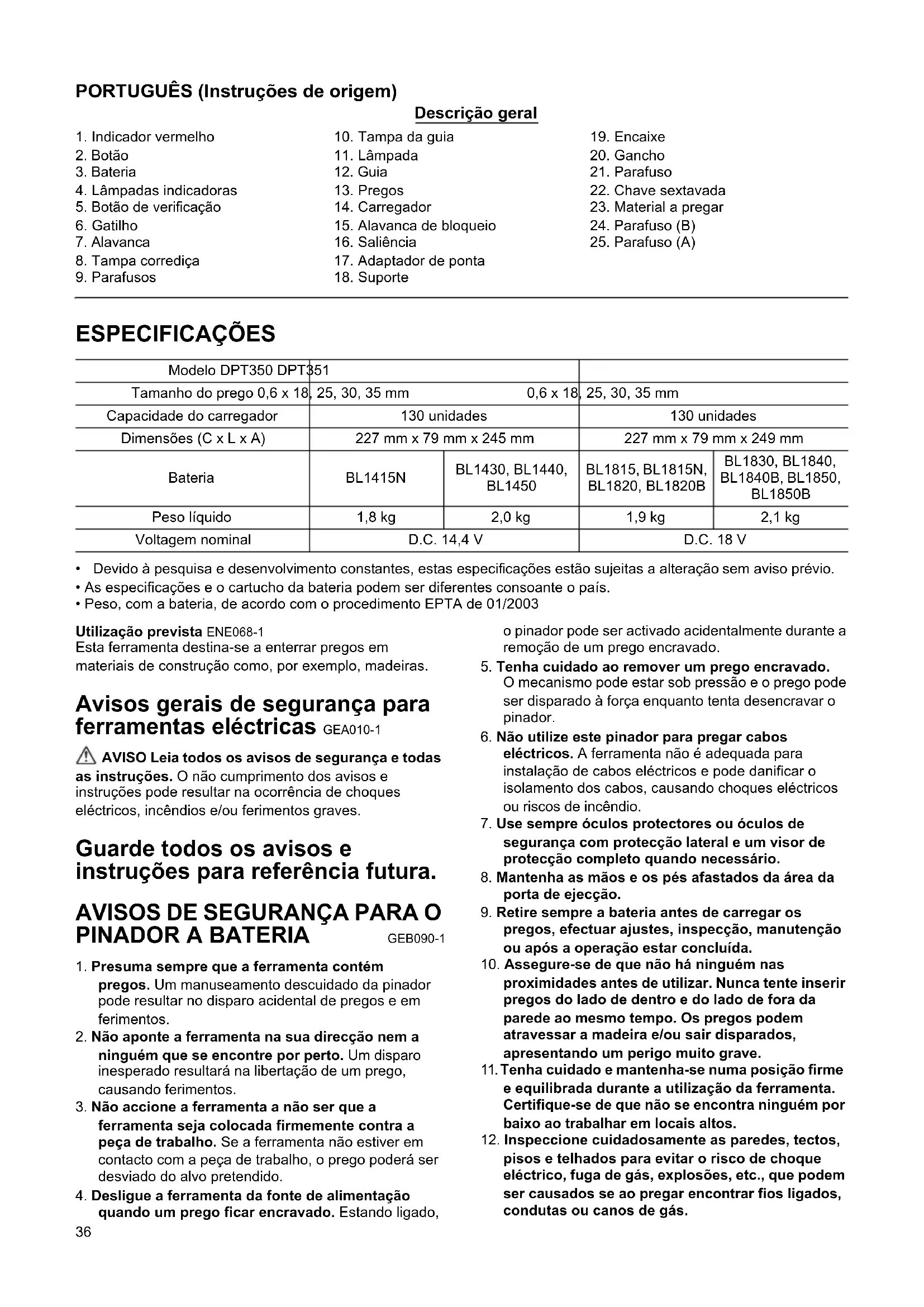 - Peso, com a bateria, de acordo com o procedimento EPTA de 01/2003 Utilização prevista ENE068-1 Esta ferramenta destina-se a enterrar pregos em materiais de construção como, por exemplo, madeiras. Avisos gerais de segurança para ferramentas eléctricas GEA010-1 AVISO Leia todos os avisos de segurança e todas as instruções. O não cumprimento dos avisos e instruções pode resultar na ocorrência de choques eléctricos, incêndios e/ou ferimentos graves. Guarde todos os avisos e instruções para referência futura.