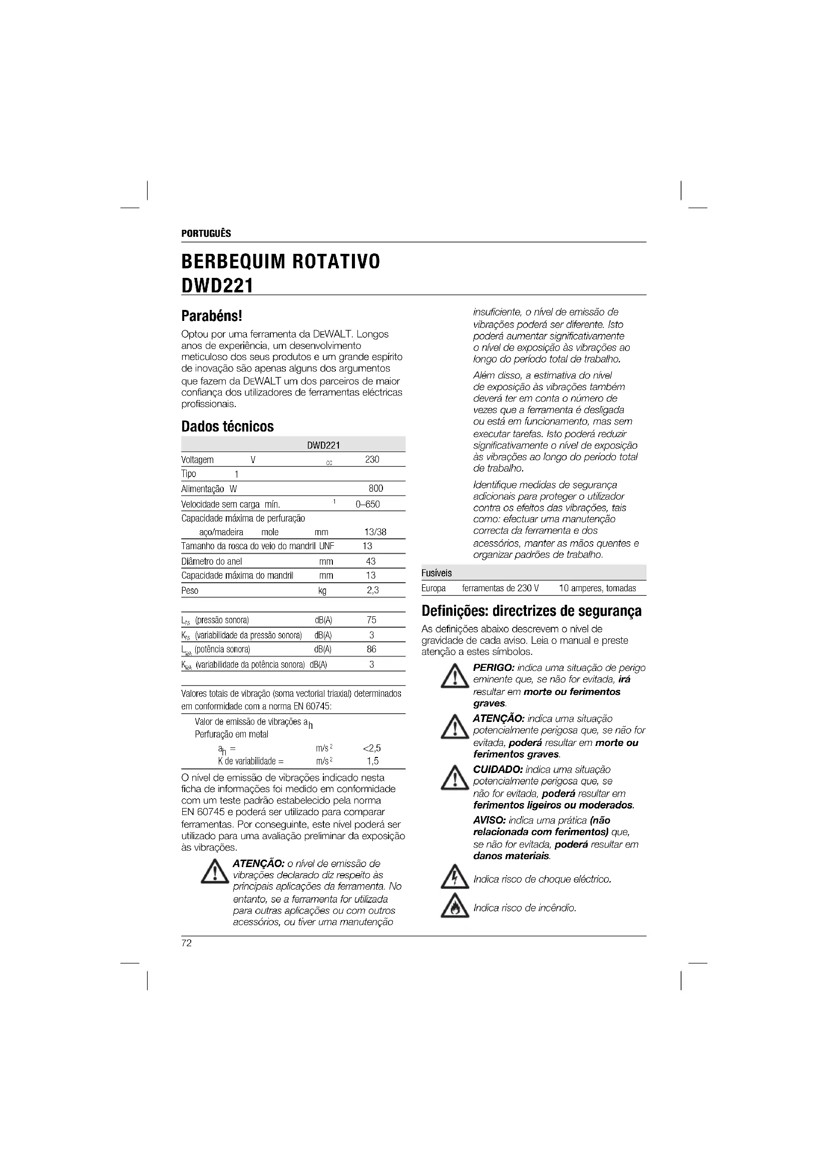 1,5 O nível de emissão de vibrações indicado nesta ficha de informações foi medido em conformidade com um teste padrão estabelecido pela norma EN 60745 e poderá ser utilizado para comparar ferramentas. Por conseguinte, este nível poderá ser utilizado para uma avaliação preliminar da exposição às vibrações. ATENÇÃO: o nível de emissão de vibrações declarado diz respeito às principais aplicações da ferramenta. No entanto, se a ferramenta for utilizada para outras aplicações ou com outros acessórios, ou tiver uma manutenção insuficiente, o nível de emissão de vibrações poderá ser diferente. Isto poderá aumentar significativamente o nível de exposição às vibrações ao longo do período total de trabalho. Além disso, a estimativa do nível de exposição às vibrações também deverá ter em conta o número de vezes que a ferramenta é desligada ou está em funcionamento, mas sem executar tarefas. Isto poderá reduzir significativamente o nível de exposição às vibrações ao longo do período total de trabalho. Identifique medidas de segurança adicionais para proteger o utilizador contra os efeitos das vibrações, tais como: efectuar uma manutenção correcta da ferramenta e dos acessórios, manter as mãos quentes e organizar padrões de trabalho. Fusíveis Europa ferramentas de 230 V 10 amperes, tomadas Defi nições: directrizes de segurança As definições abaixo descrevem o nível de gravidade de cada aviso. Leia o manual e preste atenção a estes símbolos. PERIGO: indica uma situação de perigo eminente que, se não for evitada, irá resultar em morte ou ferimentos graves. ATENÇÃO: indica uma situação potencialmente perigosa que, se não for evitada, poderá resultar em morte ou ferimentos graves. CUIDADO: indica uma situação potencialmente perigosa que, se não for evitada, poderá resultar em ferimentos ligeiros ou moderados. AVISO: indica uma prática (não relacionada com ferimentos) que, se não for evitada, poderá resultar em danos materiais. Indica risco de choque eléctrico. Indica risco de incêndio.PORTUGUÊS