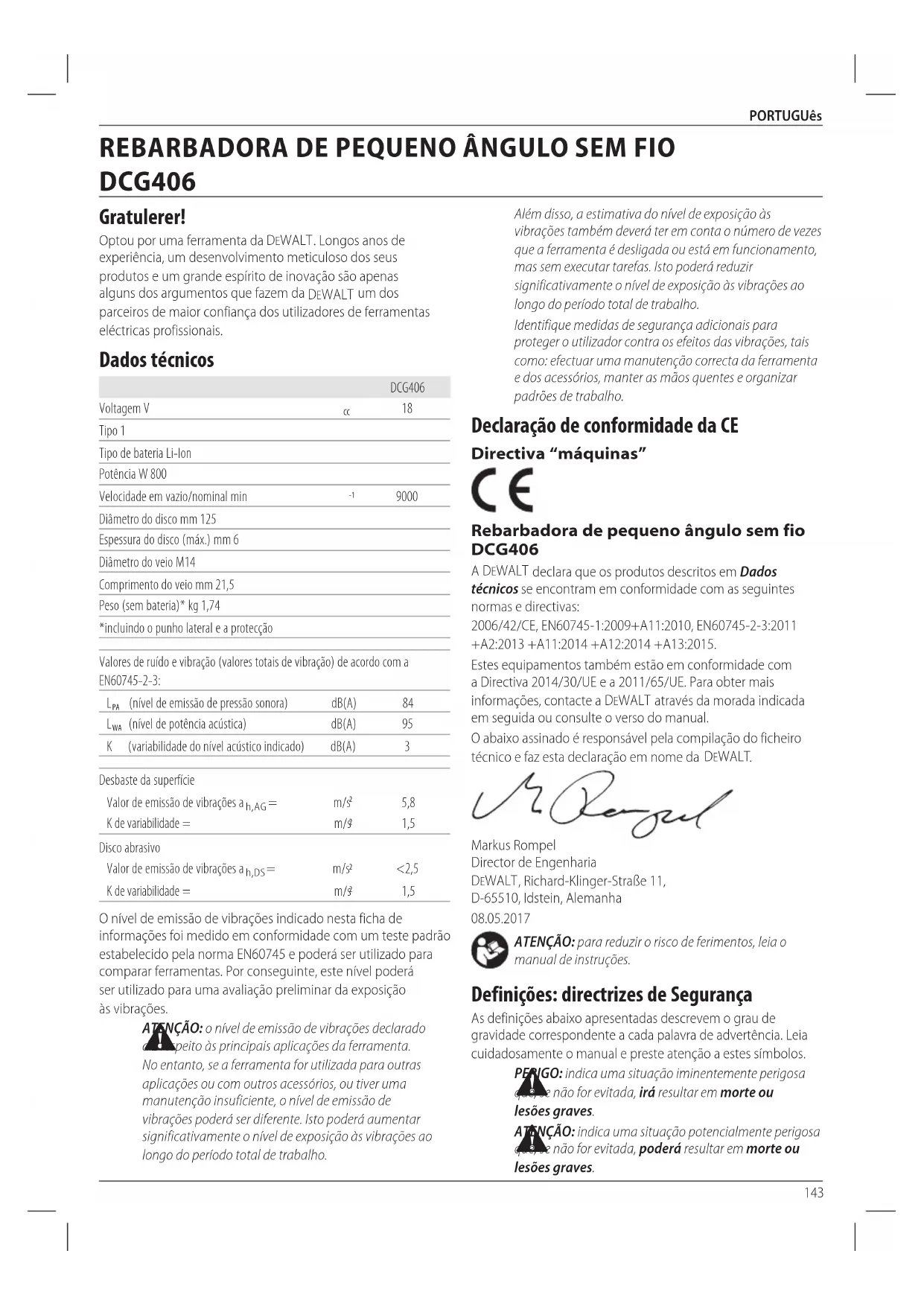 O abaixo assinado é responsavelPGA compilaçãodo ficheiro和技术 e faz esta declaração em nome da DEWALT.