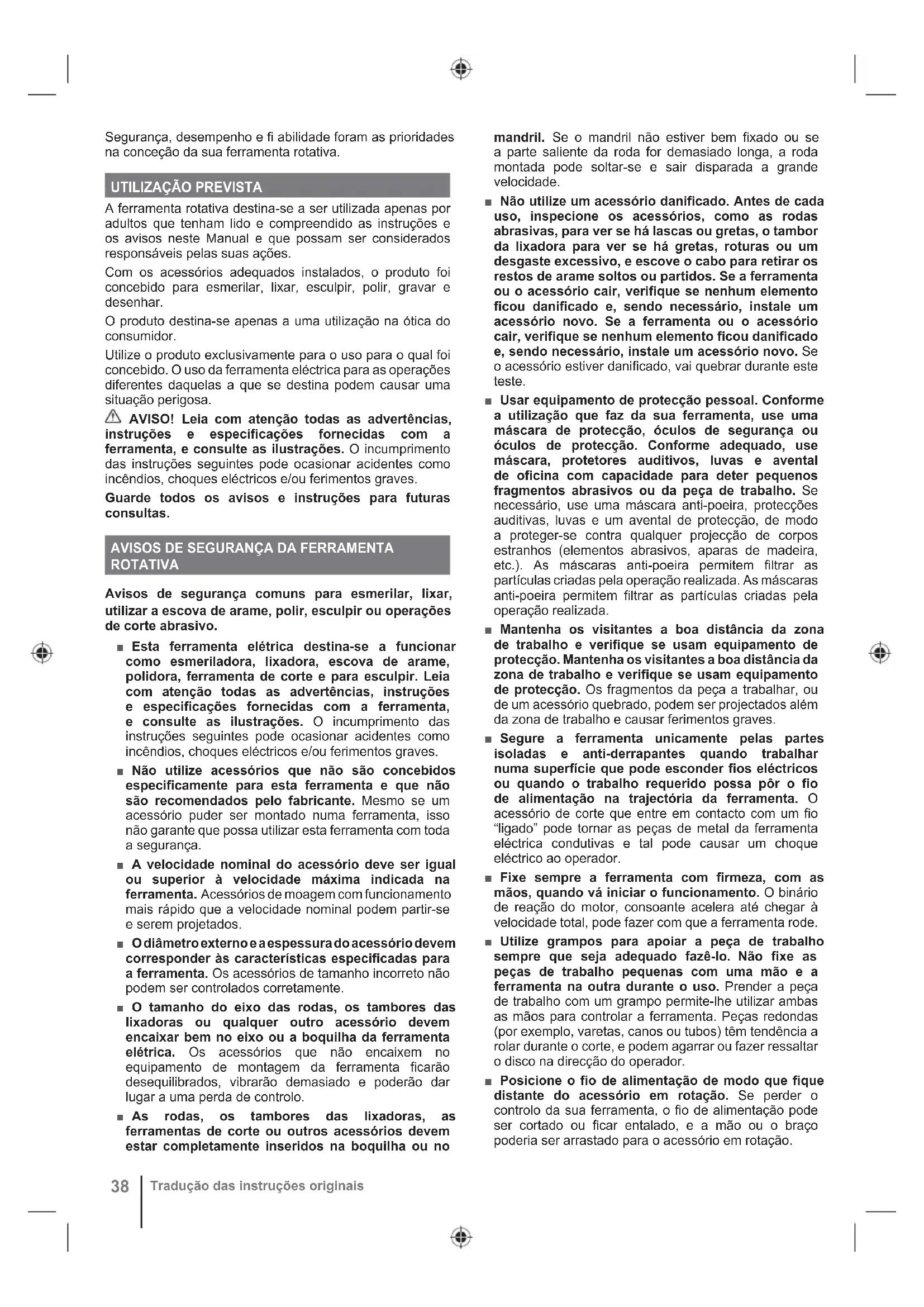 ROTATIVA Avisos de segurança comuns para esmerilar, lixar, utilizar a escova de arame, polir, esculpir ou operações de corte abrasivo. ■ Esta ferramenta elétrica destina-se a funcionar como esmeriladora, lixadora, escova de arame, polidora, ferramenta de corte e para esculpir. Leia com atenção todas as advertências, instruções e especificações fornecidas com a ferramenta, e consulte as ilustrações. O incumprimento das instruções seguintes pode ocasionar acidentes como incêndios, choques eléctricos e/ou ferimentos graves. ■ Não utilize acessórios que não são concebidos especificamente para esta ferramenta e que não são recomendados pelo fabricante. Mesmo se um acessório puder ser montado numa ferramenta, isso não garante que possa utilizar esta ferramenta com toda a segurança. ■ A velocidade nominal do acessório deve ser igual ou superior à velocidade máxima indicada na ferramenta. Acessórios de moagem com funcionamento mais rápido que a velocidade nominal podem partir-se e serem projetados. ■ O diâmetro externo e a espessura do acessório devem corresponder às características especificadas para a ferramenta. Os acessórios de tamanho incorreto não podem ser controlados corretamente. ■ O tamanho do eixo das rodas, os tambores das lixadoras ou qualquer outro acessório devem encaixar bem no eixo ou a boquilha da ferramenta elétrica. Os acessórios que não encaixem no equipamento de montagem da ferramenta ficarão desequilibrados, vibrarão demasiado e poderão dar lugar a uma perda de controlo. ■ As rodas, os tambores das lixadoras, as ferramentas de corte ou outros acessórios devem estar completamente inseridos na boquilha ou no mandril. Se o mandril não estiver bem fixado ou se a parte saliente da roda for demasiado longa, a roda montada pode soltar-se e sair disparada a grande velocidade. ■ Não utilize um acessório danificado. Antes de cada uso, inspecione os acessórios, como as rodas abrasivas, para ver se há lascas ou gretas, o tambor da lixadora para ver se há gretas, roturas ou um desgaste excessivo, e escove o cabo para retirar os restos de arame soltos ou partidos. Se a ferramenta ou o acessório cair, verifique se nenhum elemento ficou danificado e, sendo necessário, instale um acessório novo. Se a ferramenta ou o acessório cair, verifique se nenhum elemento ficou danificado e, sendo necessário, instale um acessório novo. Se o acessório estiver danificado, vai quebrar durante este teste. ■ Usar equipamento de protecção pessoal. Conforme a utilização que faz da sua ferramenta, use uma máscara de protecção, óculos de segurança ou óculos de protecção. Conforme adequado, use máscara, protetores auditivos, luvas e avental de oficina com capacidade para deter pequenos fragmentos abrasivos ou da peça de trabalho. Se necessário, use uma máscara anti-poeira, protecções auditivas, luvas e um avental de protecção, de modo a proteger-se contra qualquer projecção de corpos estranhos (elementos abrasivos, aparas de madeira, etc.). As máscaras anti-poeira permitem filtrar as partículas criadas pela operação realizada. As máscaras anti-poeira permitem filtrar as partículas criadas pela operação realizada. ■ Mantenha os visitantes a boa distância da zona de trabalho e verifique se usam equipamento de protecção. Mantenha os visitantes a boa distância da zona de trabalho e verifique se usam equipamento de protecção. Os fragmentos da peça a trabalhar, ou de um acessório quebrado, podem ser projectados além da zona de trabalho e causar ferimentos graves. ■ Segure a ferramenta unicamente pelas partes isoladas e anti-derrapantes quando trabalhar numa superfície que pode esconder fios eléctricos ou quando o trabalho requerido possa pôr o fio de alimentação na trajectória da ferramenta. O acessório de corte que entre em contacto com um fio “ligado” pode tornar as peças de metal da ferramenta eléctrica condutivas e tal pode causar um choque eléctrico ao operador. ■ Fixe sempre a ferramenta com firmeza, com as mãos, quando vá iniciar o funcionamento. O binário de reação do motor, consoante acelera até chegar à velocidade total, pode fazer com que a ferramenta rode. ■ Utilize grampos para apoiar a peça de trabalho sempre que seja adequado fazê-lo. Não fixe as peças de trabalho pequenas com uma mão e a ferramenta na outra durante o uso. Prender a peça de trabalho com um grampo permite-lhe utilizar ambas as mãos para controlar a ferramenta. Peças redondas (por exemplo, varetas, canos ou tubos) têm tendência a rolar durante o corte, e podem agarrar ou fazer ressaltar o disco na direcção do operador. ■ Posicione o fio de alimentação de modo que fique distante do acessório em rotação. Se perder o controlo da sua ferramenta, o fio de alimentação pode ser cortado ou ficar entalado, e a mão ou o braço poderia ser arrastado para o acessório em rotação.