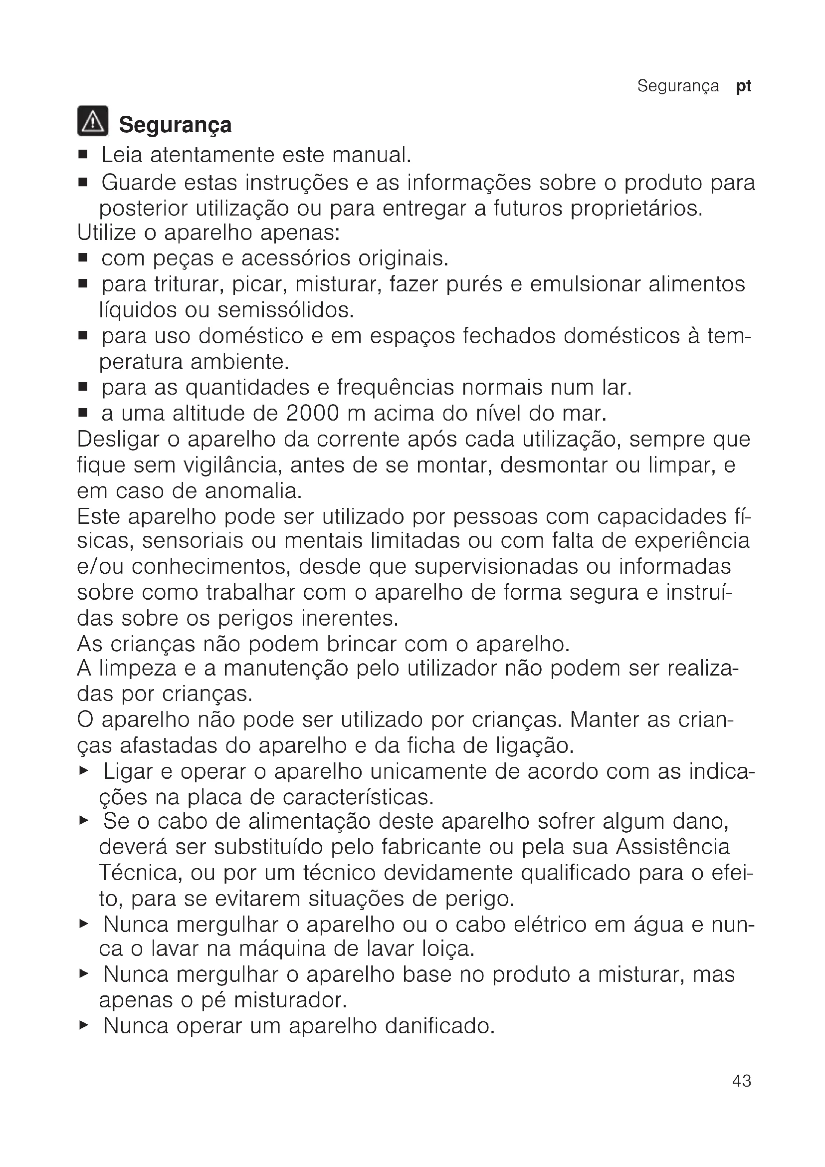 Segurança ¡ Leia atentamente este manual. ¡ Guarde estas instruções e as informações sobre o produto para posterior utilização ou para entregar a futuros proprietários. Utilize o aparelho apenas: ¡ com peças e acessórios originais. ¡ para triturar, picar, misturar, fazer purés e emulsionar alimentos líquidos ou semissólidos. ¡ para uso doméstico e em espaços fechados domésticos à tem- peratura ambiente. ¡ para as quantidades e frequências normais num lar. ¡ a uma altitude de 2000m acima do nível do mar. Desligar o aparelho da corrente após cada utilização, sempre que fique sem vigilância, antes de se montar, desmontar ou limpar, e em caso de anomalia. Este aparelho pode ser utilizado por pessoas com capacidades fí- sicas, sensoriais ou mentais limitadas ou com falta de experiência e/ou conhecimentos, desde que supervisionadas ou informadas sobre como trabalhar com o aparelho de forma segura e instruí- das sobre os perigos inerentes. As crianças não podem brincar com o aparelho. A limpeza e a manutenção pelo utilizador não podem ser realiza- das por crianças. O aparelho não pode ser utilizado por crianças. Manter as crian- ças afastadas do aparelho e da ficha de ligação. ▶ Ligar e operar o aparelho unicamente de acordo com as indica- ções na placa de características. ▶ Se o cabo de alimentação deste aparelho sofrer algum dano, deverá ser substituído pelo fabricante ou pela sua Assistência Técnica, ou por um técnico devidamente qualificado para o efei- to, para se evitarem situações de perigo. ▶ Nunca mergulhar o aparelho ou o cabo elétrico em água e nun- ca o lavar na máquina de lavar loiça. ▶ Nunca mergulhar o aparelho base no produto a misturar, mas apenas o pé misturador. ▶ Nunca operar um aparelho danificado.pt Evitar danos materiais