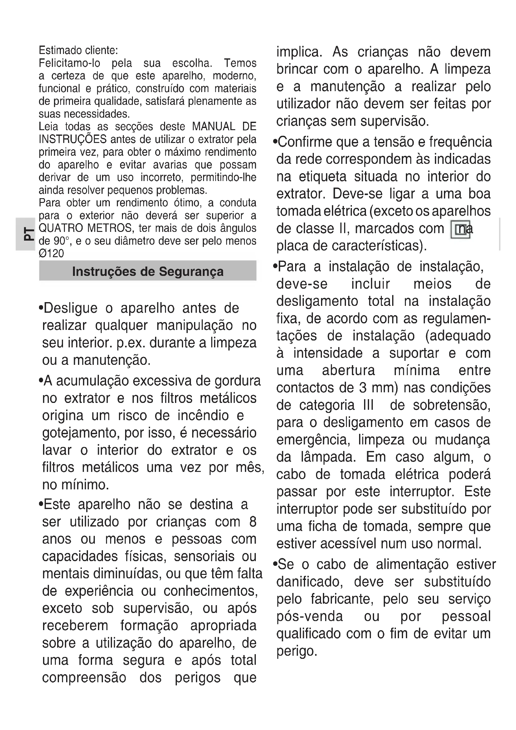 - Se o cabo de alimentação estiver danificado, deve ser substituído pelo fabricante, pelo seu serviço pós-venda ou por pessoal qualificado com o fim de evitar um perigo. Instruções de Segurança PT•O ar evacuado não deve ser enviado por condutas que se utilizarem para evacuar os fumos de aparelhos alimentados por gás ou outro combustível.