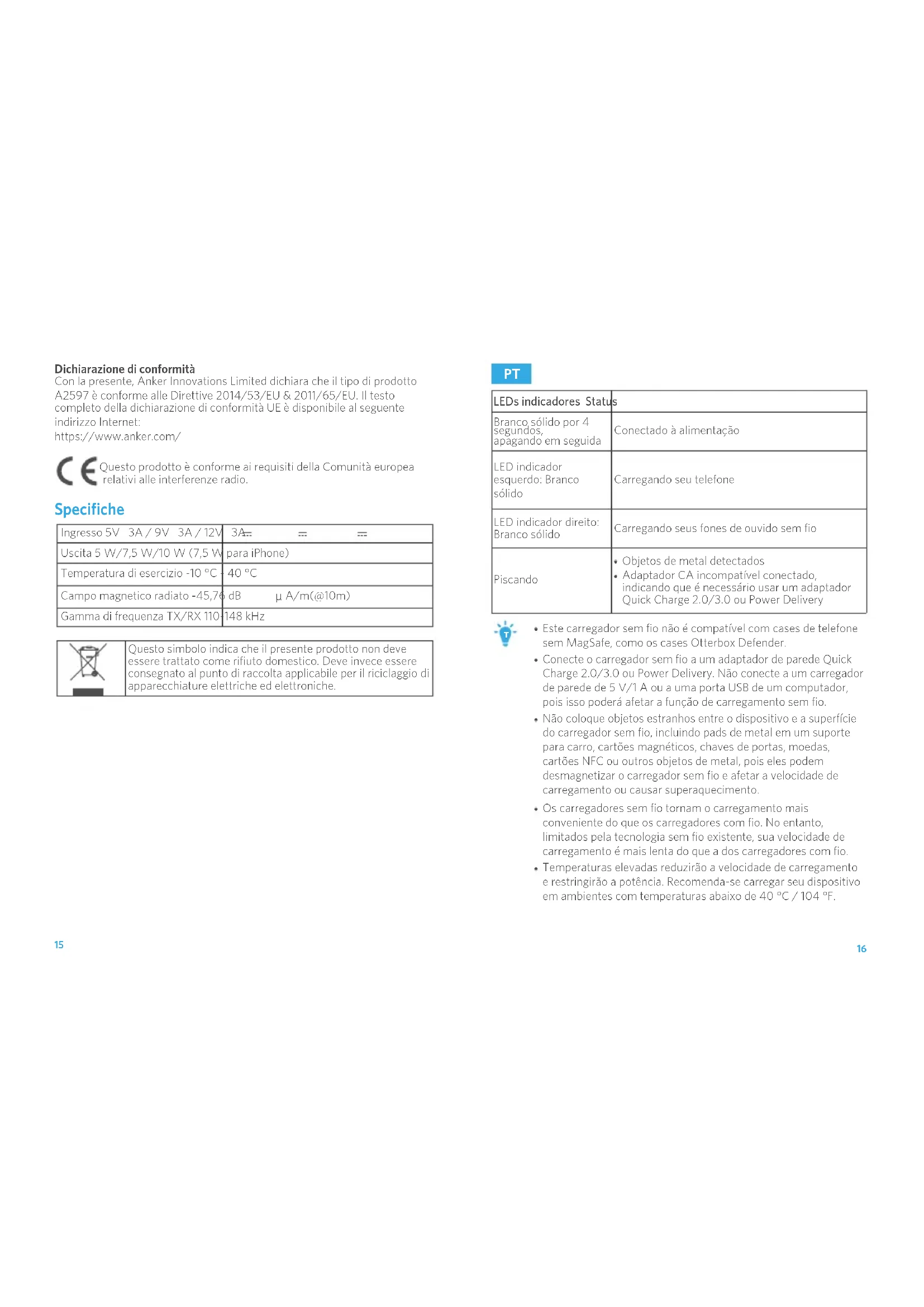A desconexão da tomada deve ser feita pelo plugue CA. Declaração de conformidade A Anker Innovations Limited declara por meio desta que o tipo de produto A2597 está em conformidade com as Diretivas 2014/53/UE e 2011/65/UE. O texto completo da declaração de conformidade da UE está disponível no seguinte endereço de Internet: https://www.anker.com/ Este produto atende aos requisitos de interferência de rádio da Comunidade Europeia. Especificações Entrada 5V 3A / 9V 3A / 12V 3A Saída 5 W/7,5 W/10 W (7,5 W para iPhone) Temperatura de operação -10 °C – 40 °C Campo H irradiado -45,76 dB