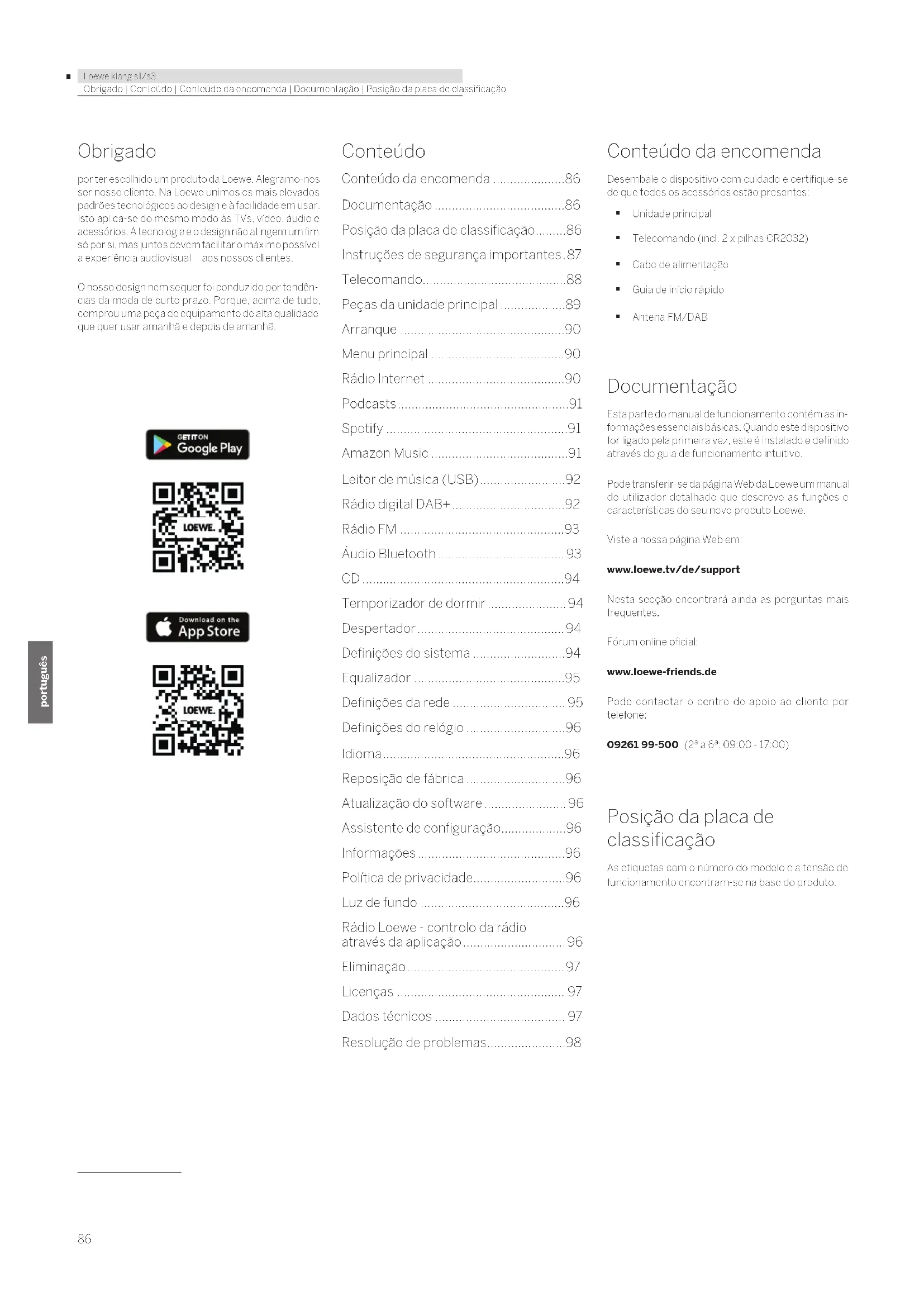 - Resolução de problemas Conteúdo da encomenda Desembale o dispositivo com cuidado e certifique-se de que todos os acessórios estão presentes: Unidade principal Telecomando (incl. 2 x pilhas CR2032) Cabo de alimentação Guia de início rápido Antena FM/DAB Documentação Esta parte do manual de funcionamento contém as in- formações essenciais básicas. Quando este dispositivo for ligado pela primeira vez, este é instalado e definido através do guia de funcionamento intuitivo. Pode transferir-se da página Web da Loewe um manual do utilizador detalhado que descreve as funções e características do seu novo produto Loewe. Viste a nossa página Web em: www.loewe.tv/de/support Nesta secção encontrará ainda as perguntas mais frequentes. Fórum online oficial: www.loewe-friends.de Pode contactar o centro de apoio ao cliente por telefone: 09261 99-500 (2ª a 6ª: 09:00 - 17:00) Posição da placa de classificação As etiquetas com o número do modelo e a tensão de funcionamento encontram-se na base do produto.87 p. 98