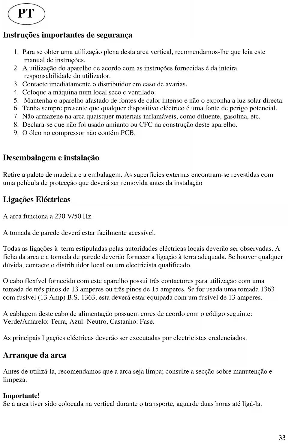 Desembalagem e instalação Retire a palete de madeira e a embalagem. As superfícies externas encontram-se revestidas com uma película de protecção que deverá ser removida antes da instalação Ligações Eléctricas A arca funciona a 230 V/50 Hz. A tomada de parede deverá estar facilmente acessível. Todas as ligações à terra estipuladas pelas autoridades eléctricas locais deverão ser observadas. A ficha da arca e a tomada de parede deverão fornecer a ligação à terra adequada. Se houver qualquer dúvida, contacte o distribuidor local ou um electricista qualificado. O cabo flexível fornecido com este aparelho possui três contactores para utilização com uma tomada de três pinos de 13 amperes ou três pinos de 15 amperes. Se for usada uma tomada 1363 com fusível (13 Amp) B.S. 1363, esta deverá estar equipada com um fusível de 13 amperes. A cablagem deste cabo de alimentação possuem cores de acordo com o código seguinte: Verde/Amarelo: Terra, Azul: Neutro, Castanho: Fase. As principais ligações eléctricas deverão ser executadas por electricistas credenciados. Arranque da arca Antes de utilizá-la, recomendamos que a arca seja limpa; consulte a secção sobre manutenção e limpeza. Importante! Se a arca tiver sido colocada na vertical durante o transporte, aguarde duas horas até ligá-la.