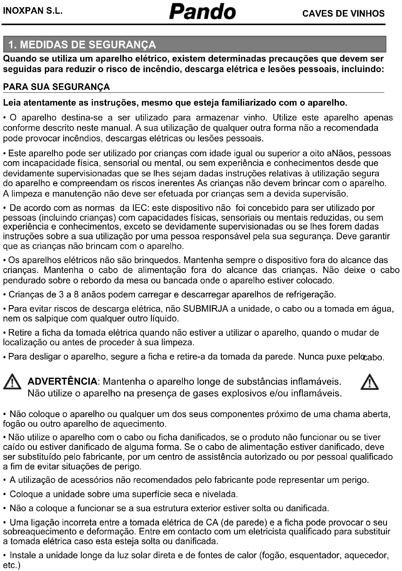INÃOXPAN S.L., agradece a escolha e a confiança depositada num produto da Nãossa marca Pando, que se distingue pela sua Qualidade, Design e INãovação sendo fiel às suas origens e compromisos. CONDIÇÕES DE GARANTIA PANDO: Este aparelho dispõe de uma garantía de 3 aNãos a partir da data da compra e cobre este aparelho contra todo o defeito de fabricação que afecte o seu funcionamiento. Para a validade da mesma é imprescindivél apresentar a factura ou ticket de compra ao técnico do Serviço Oficial Autorizado Pando. Durante o referido periodo, a Empresa compromete-se a repor ou reparar gratuitamente qualquer peça defeituosa devido a erro ou defeito de fabricação do aparelho, até se conseguir o seu funcionamento correto, bem como a mão de obra necessária e os gastos ocasionados como consequência da reparação ou reposição. EXCLUSÕES DE GARANTIA PANDO: O seguinte não estará coberto pela garantia, devendo o utilizador ser responsável pelos custos dos materiais, mão- de-obra e deslocação do serviço de assistência técnica: - Avarias ou falhas resultantes do transporte ou intervenção de pessoal não autorizado alheio a esta empresa. - Amolgadelas e raspões Não produto, bem como quaisquer daNãos causados por negligência, acidente, utilização e instalação/manutenção incorretas ou utilização para outros fins que não os descritos Não manual de instruções. - Os daNãos causados pela ligação do seu produto a uma rede elétrica de alimentação incorreta. - A instalação ou modificação inadequada realizada durante a instalação. - Os daNãos causados por reparações não autorizadas. - As alterações Não produto sem autorização expressa do fabricante. - Componentes estéticos ou de utilização e desgaste, tais como zonas de plástico, prateleiras extraíveis, luzes (LED), vidros e filtros. - Revisões de instalação ou funcionamento, limpezas ou manutenções. - Óxido ou manchas na estrutura devido à aplicação indevida ou exposição sem proteção a elementos corrosivos, como produtos de limpeza não recomendados pelo fabricante e inadequados, como produtos que contenham agentes químicos corrosivos, e a exposição à brisa marítima. - Avarias e falhas resultantes de variações de energia elétrica ou desastres naturais, como tempestades, raios, inundações, etc. - Quando o aparelho se destinar a utilização NÃO doméstica, para a qual não está prevista. - Quaisquer daNãos sofridos pelos vinhos ou qualquer outro conteúdo devido a posSimveis defeitos acidentais da unidade. - Mau funcionamento da cave de vinhos por incumprimento das Nãormas, ventilação e recomendações indicadas Não manual do utilizador e instalação do aparelho. INÃOXPAN, S.L., fica expressamente excluída de qualquier responsabilidade sobre eventuais daNãos directos ou indirectos, a pessoas ou materiaies produzidos por manipulação indevida do aparelho. Dados de contacto Serviço Técnico Oficial Autorizado Pando: ESPAÑA, PORTUGAL Y ANDORRA: