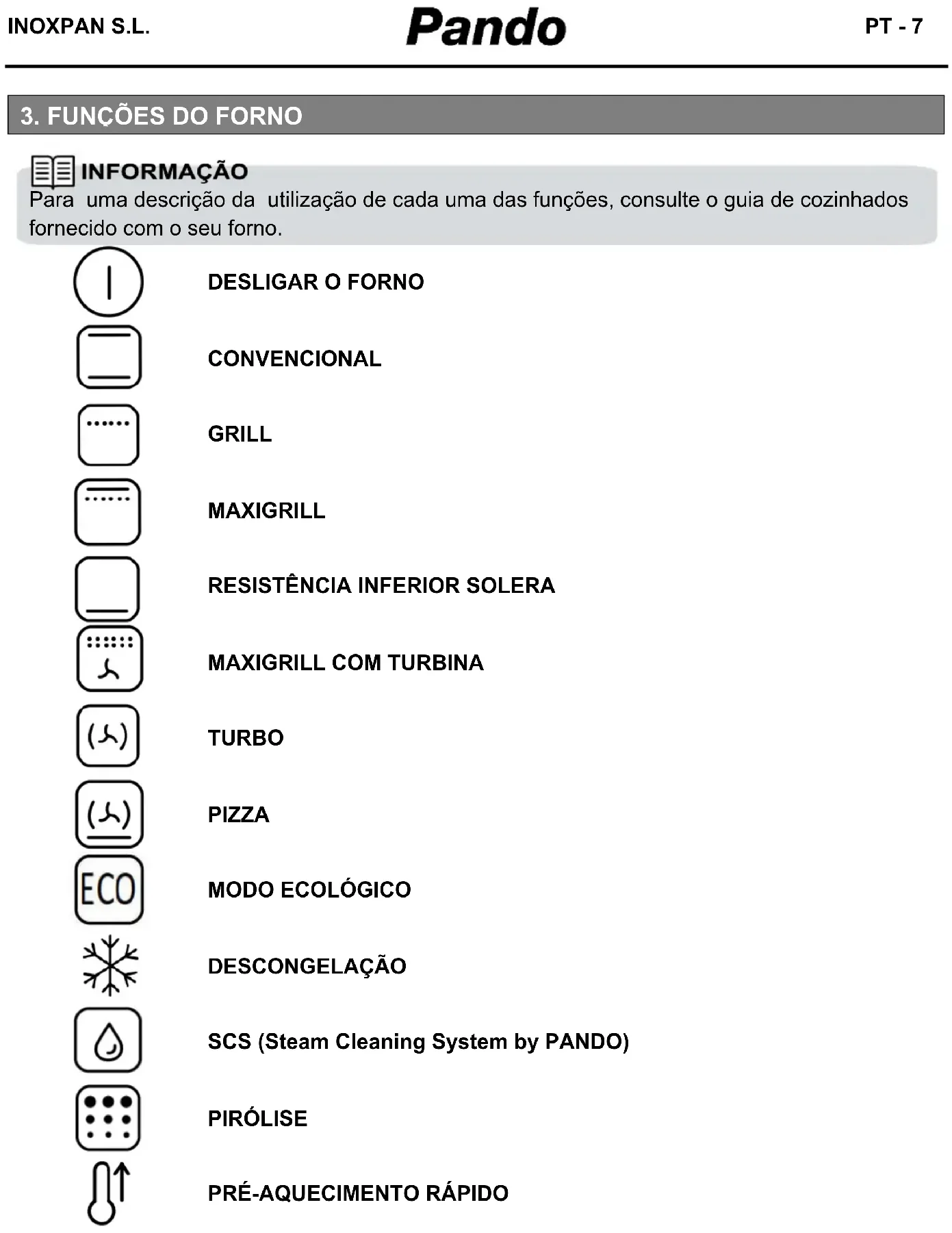 Para uma descrição da utilização de cada uma das funções, consulte o guia de cozinhados fornecido com o seu forno.INOXPAN S.L. PT - 8