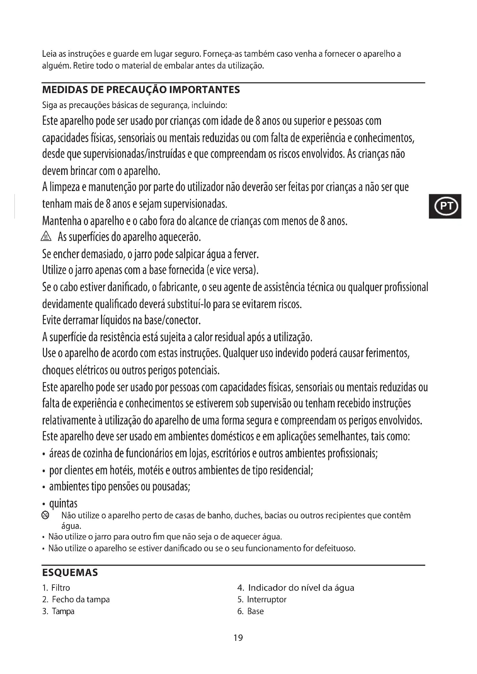 Siga as precauções básicas de segurança, incluindo: Este aparelho pode ser usado por crianças com idade de 8 anos ou superior e pessoas com capacidades físicas, sensoriais ou mentais reduzidas ou com falta de experiência e conhecimentos, desde que supervisionadas/instruídas e que compreendam os riscos envolvidos. As crianças não devem brincar com o aparelho. A limpeza e manutenção por parte do utilizador não deverão ser feitas por crianças a não ser que tenham mais de 8 anos e sejam supervisionadas. Mantenha o aparelho e o cabo fora do alcance de crianças com menos de 8 anos. h As superfícies do aparelho aquecerão. Se encher demasiado, o jarro pode salpicar água a ferver. Utilize o jarro apenas com a base fornecida (e vice versa). Se o cabo estiver danificado, o fabricante, o seu agente de assistência técnica ou qualquer profissional devidamente qualificado deverá substituí-lo para se evitarem riscos. Evite derramar líquidos na base/conector. A superfície da resistência está sujeita a calor residual após a utilização. Use o aparelho de acordo com estas instruções. Qualquer uso indevido poderá causar ferimentos, choques elétricos ou outros perigos potenciais. Este aparelho pode ser usado por pessoas com capacidades físicas, sensoriais ou mentais reduzidas ou falta de experiência e conhecimentos se estiverem sob supervisão ou tenham recebido instruções relativamente à utilização do aparelho de uma forma segura e compreendam os perigos envolvidos. Este aparelho deve ser usado em ambientes domésticos e em aplicações semelhantes, tais como: