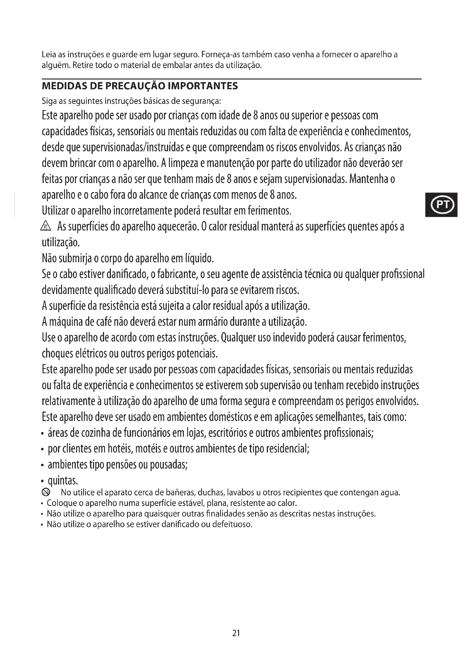 Siga as seguintes instruções básicas de segurança: Este aparelho pode ser usado por crianças com idade de 8 anos ou superior e pessoas com capacidades físicas, sensoriais ou mentais reduzidas ou com falta de experiência e conhecimentos, desde que supervisionadas/instruídas e que compreendam os riscos envolvidos. As crianças não devem brincar com o aparelho. A limpeza e manutenção por parte do utilizador não deverão ser feitas por crianças a não ser que tenham mais de 8 anos e sejam supervisionadas. Mantenha o aparelho e o cabo fora do alcance de crianças com menos de 8 anos. Utilizar o aparelho incorretamente poderá resultar em ferimentos. h As superfícies do aparelho aquecerão. O calor residual manterá as superfícies quentes após a utilização. Não submirja o corpo do aparelho em líquido. Se o cabo estiver danicado, o fabricante, o seu agente de assistência técnica ou qualquer prossional devidamente qualicado deverá substituí-lo para se evitarem riscos. A superfície da resistência está sujeita a calor residual após a utilização. A máquina de café não deverá estar num armário durante a utilização. Use o aparelho de acordo com estas instruções. Qualquer uso indevido poderá causar ferimentos, choques elétricos ou outros perigos potenciais. Este aparelho pode ser usado por pessoas com capacidades físicas, sensoriais ou mentais reduzidas ou falta de experiência e conhecimentos se estiverem sob supervisão ou tenham recebido instruções relativamente à utilização do aparelho de uma forma segura e compreendam os perigos envolvidos. Este aparelho deve ser usado em ambientes domésticos e em aplicações semelhantes, tais como:
