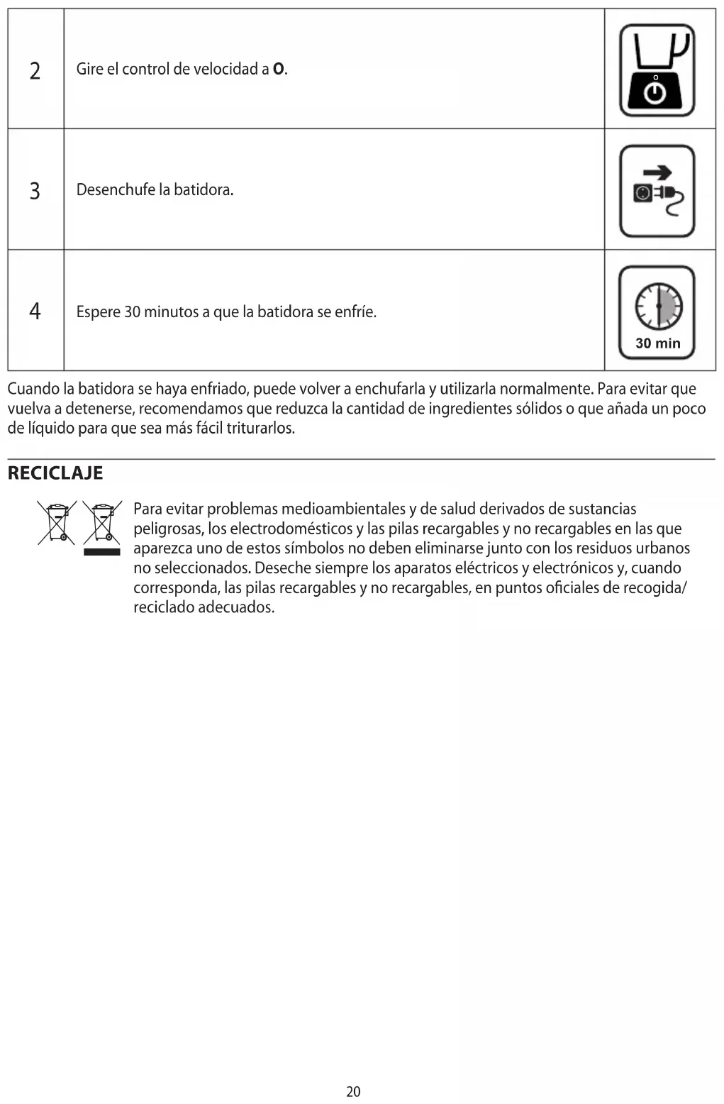 Deixe-a arrefecer durante 30 minutos. 30 min Depois de ter arrefecido, pode ligá-la novamente e colocá-la a funcionar normalmente. Para evitar outra situação como esta, recomendamos que reduza a quantidade de ingredientes mais espessos ou adicione um pouco de líquido para fazer com que sejam mais fáceis de misturar. RECICLAGEM