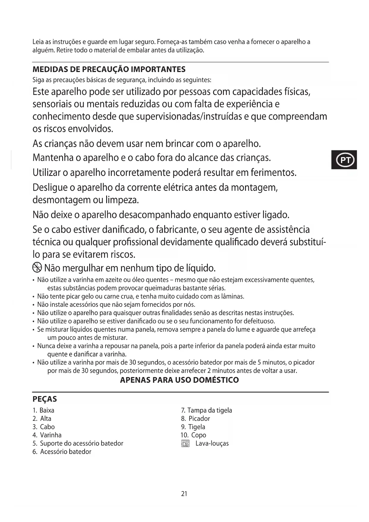 Siga as precauções básicas de segurança, incluindo as seguintes: Este aparelho pode ser utilizado por pessoas com capacidades físicas, sensoriais ou mentais reduzidas ou com falta de experiência e conhecimento desde que supervisionadas/instruídas e que compreendam os riscos envolvidos. As crianças não devem usar nem brincar com o aparelho. Mantenha o aparelho e o cabo fora do alcance das crianças. Utilizar o aparelho incorretamente poderá resultar em ferimentos. Desligue o aparelho da corrente elétrica antes da montagem, desmontagem ou limpeza. Não deixe o aparelho desacompanhado enquanto estiver ligado. Se o cabo estiver danificado, o fabricante, o seu agente de assistência técnica ou qualquer profissional devidamente qualificado deverá substituí- lo para se evitarem riscos. i Não mergulhar em nenhum tipo de líquido.