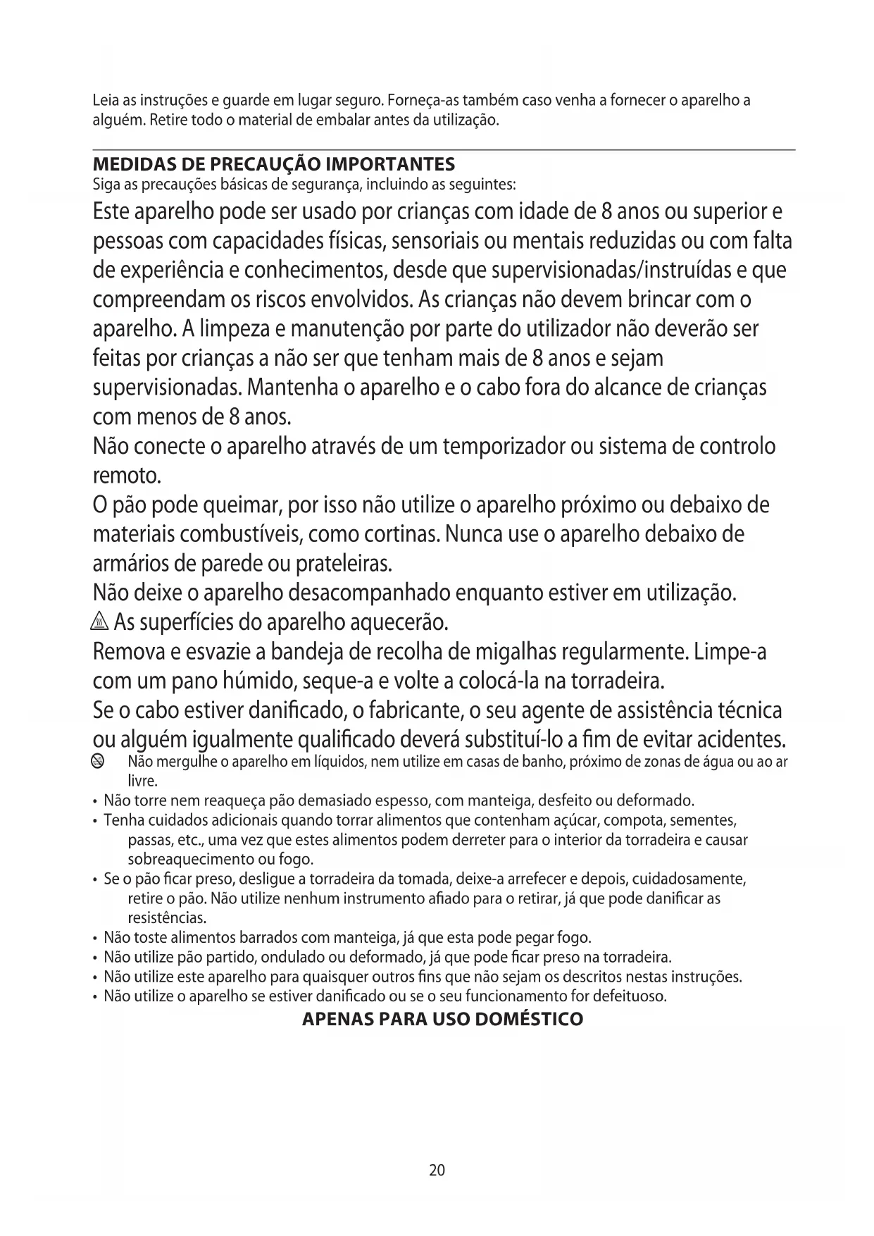 Siga as precauções básicas de segurança, incluindo as seguintes: Este aparelho pode ser usado por crianças com idade de 8 anos ou superior e pessoas com capacidades físicas, sensoriais ou mentais reduzidas ou com falta de experiência e conhecimentos, desde que supervisionadas/instruídas e que compreendam os riscos envolvidos. As crianças não devem brincar com o aparelho. A limpeza e manutenção por parte do utilizador não deverão ser feitas por crianças a não ser que tenham mais de 8 anos e sejam supervisionadas. Mantenha o aparelho e o cabo fora do alcance de crianças com menos de 8 anos. Não conecte o aparelho através de um temporizador ou sistema de controlo remoto. O pão pode queimar, por isso não utilize o aparelho próximo ou debaixo de materiais combustíveis, como cortinas. Nunca use o aparelho debaixo de armários de parede ou prateleiras. Não deixe o aparelho desacompanhado enquanto estiver em utilização. h As superfícies do aparelho aquecerão. Remova e esvazie a bandeja de recolha de migalhas regularmente. Limpe-a com um pano húmido, seque-a e volte a colocá-la na torradeira. Se o cabo estiver danicado, o fabricante, o seu agente de assistência técnica ou alguém igualmente qualicado deverá substituí-lo a m de evitar acidentes. b Não mergulhe o aparelho em líquidos, nem utilize em casas de banho, próximo de zonas de água ou ao ar livre.