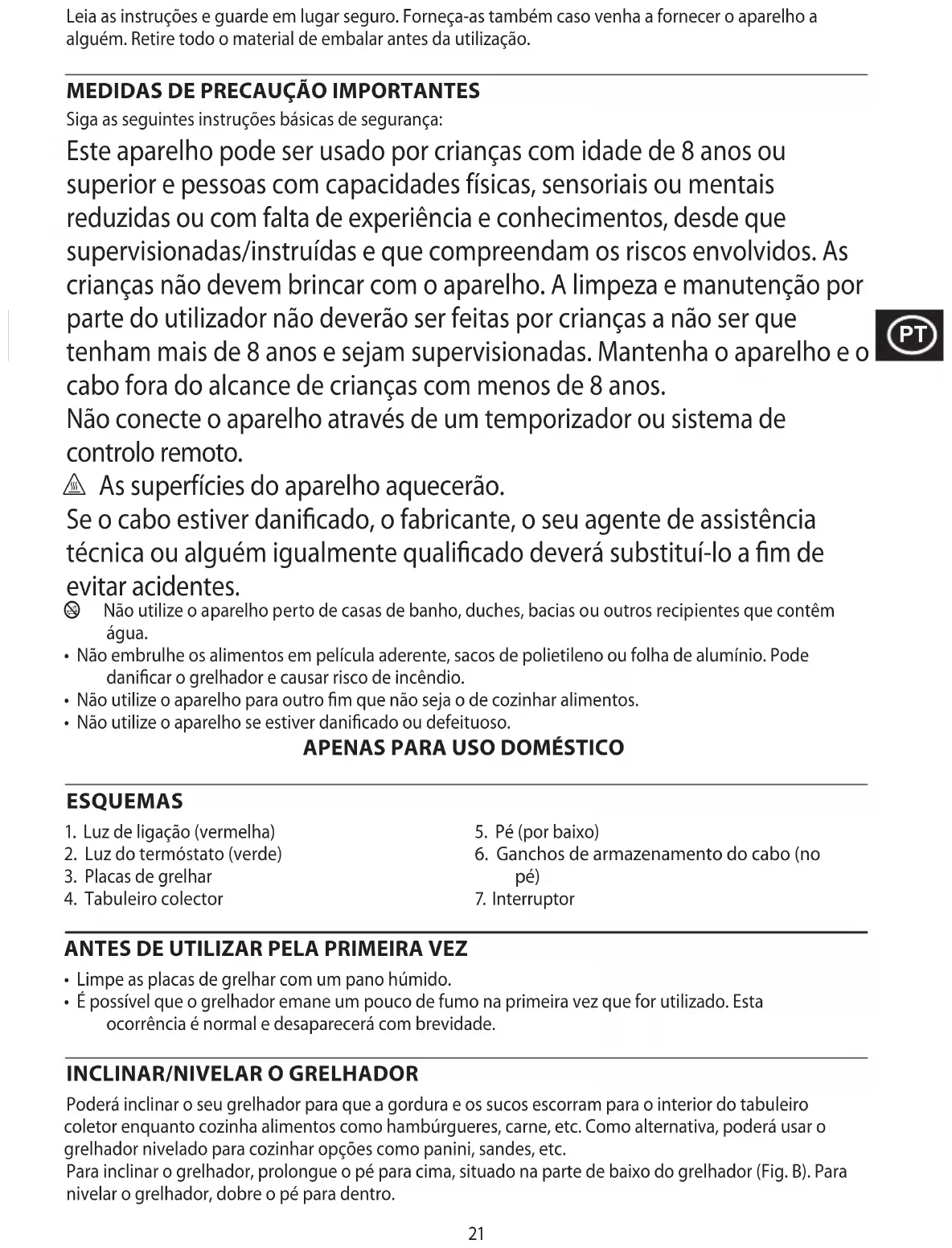 Siga as seguintes instruções básicas de segurança: Este aparelho pode ser usado por crianças com idade de 8 anos ou superior e pessoas com capacidades físicas, sensoriais ou mentais reduzidas ou com falta de experiência e conhecimentos, desde que supervisionadas/instruídas e que compreendam os riscos envolvidos. As crianças não devem brincar com o aparelho. A limpeza e manutenção por parte do utilizador não deverão ser feitas por crianças a não ser que tenham mais de 8 anos e sejam supervisionadas. Mantenha o aparelho e o cabo fora do alcance de crianças com menos de 8 anos. Não conecte o aparelho através de um temporizador ou sistema de controlo remoto. ¬ As superfícies do aparelho aquecerão. Se o cabo estiver danificado, o fabricante, o seu agente de assistência técnica ou alguém igualmente qualificado deverá substituí-lo a fim de evitar acidentes. b Não utilize o aparelho perto de casas de banho, duches, bacias ou outros recipientes que contêm água.