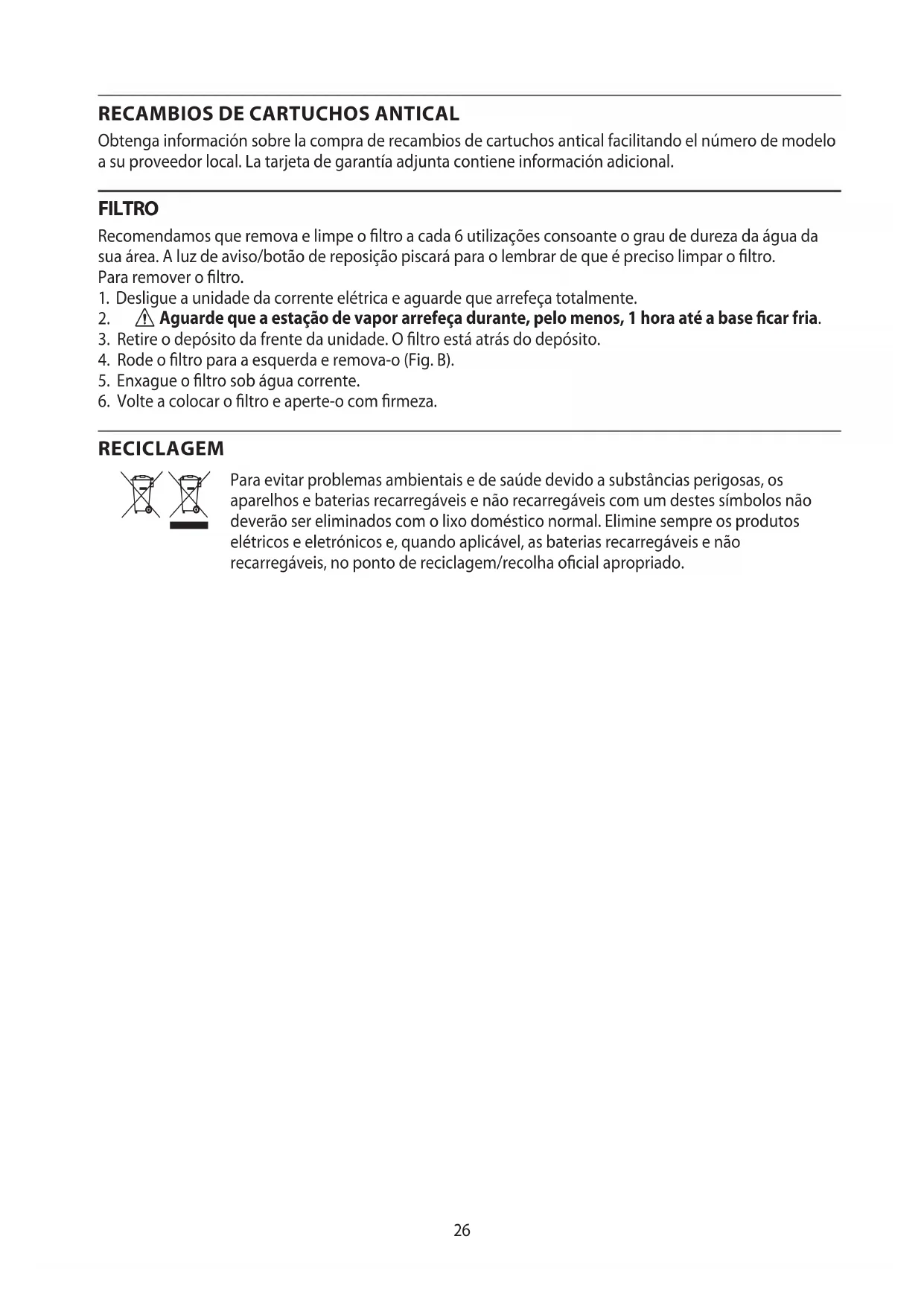 Obtenga información sobre la compra de recambios de cartuchos antical facilitando el número de modelo a su proveedor local. La tarjeta de garantía adjunta contiene información adicional. FILTRO Recomendamos que remova e limpe o ltro a cada 6 utilizações consoante o grau de dureza da água da sua área. A luz de aviso/botão de reposição piscará para o lembrar de que é preciso limpar o ltro. Para remover o ltro.