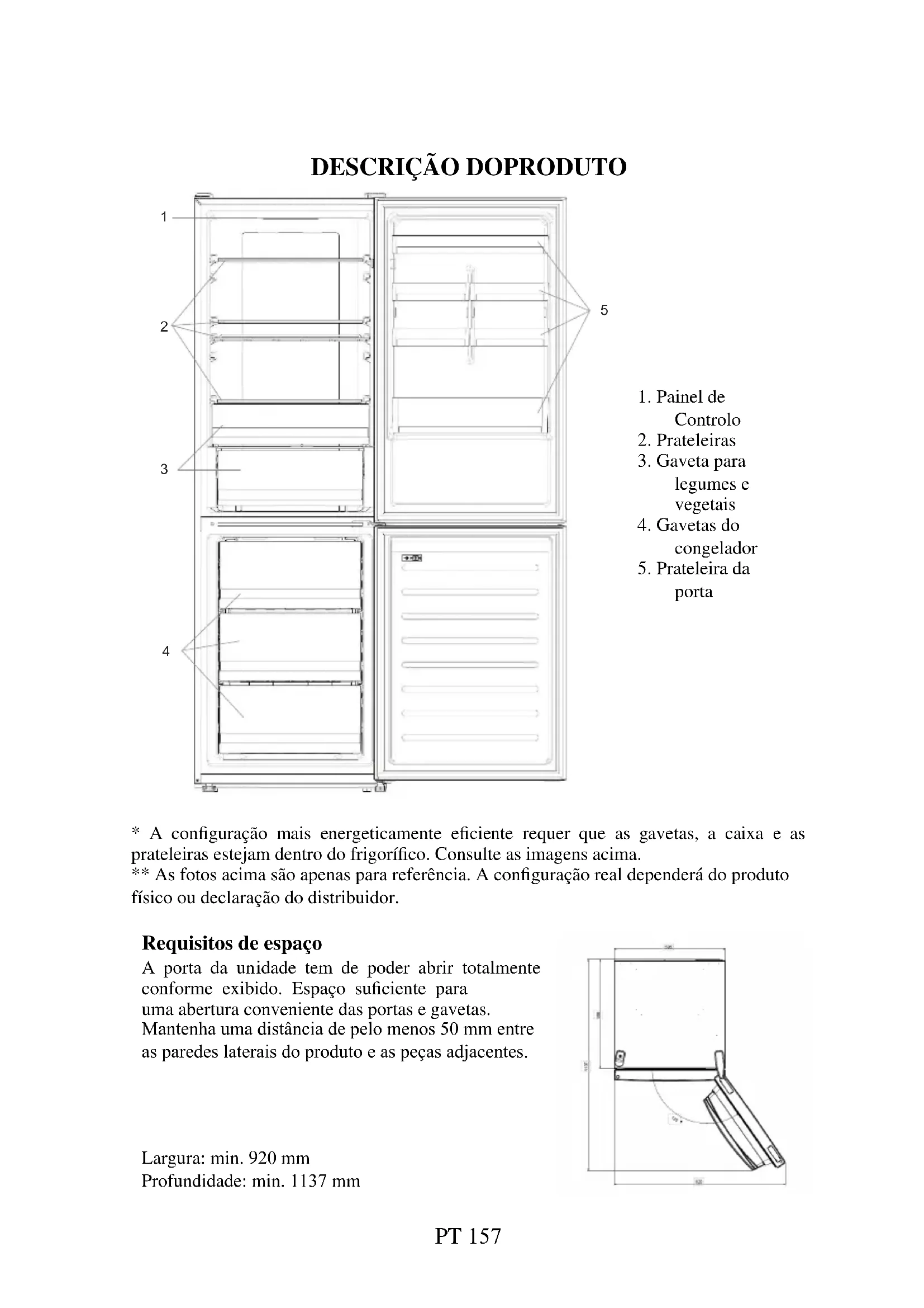 - A configuração mais energeticamente eficiente requer que as gavetas, a caixa e as prateleiras estejam dentro do frigorífico. Consulte as imagens acima. ** As fotos acima são apenas para referência. A configuração real dependerá do produto físico ou declaração do distribuidor. Requisitos de espaço A porta da unidade tem de poder abrir totalmente conforme exibido. Espaço suficiente para uma abertura conveniente das portas e gavetas. Mantenha uma distância de pelo menos 50 mm entre as paredes laterais do produto e as peças adjacentes. Largura: min. 920 mm Profundidade: min. 1137 mm
