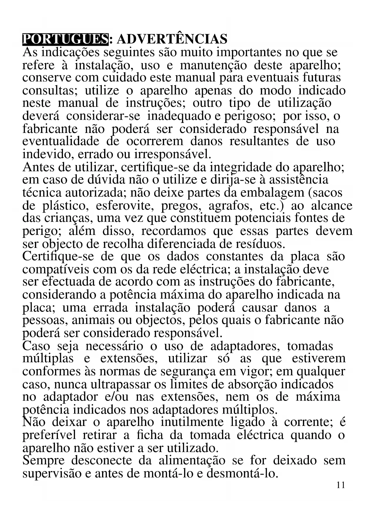 As indicações seguintes são muito importantes no que se refere à instalação, uso e manutenção deste aparelho; conserve com cuidado este manual para eventuais futuras consultas; utilize o aparelho apenas do modo indicado neste manual de instruções; outro tipo de utilização deverá considerar-se inadequado e perigoso; por isso, o fabricante não poderá ser considerado responsável na eventualidade de ocorrerem danos resultantes de uso indevido, errado ou irresponsável. Antes de utilizar, certifique-se da integridade do aparelho; em caso de dúvida não o utilize e dirija-se à assistência técnica autorizada; não deixe partes da embalagem (sacos de plástico, esferovite, pregos, agrafos, etc.) ao alcance das crianças, uma vez que constituem potenciais fontes de perigo; além disso, recordamos que essas partes devem ser objecto de recolha diferenciada de resíduos. Certifique-se de que os dados constantes da placa são compatíveis com os da rede eléctrica; a instalação deve ser efectuada de acordo com as instruções do fabricante, considerando a potência máxima do aparelho indicada na placa; uma errada instalação poderá causar danos a pessoas, animais ou objectos, pelos quais o fabricante não poderá ser considerado responsável. Caso seja necessário o uso de adaptadores, tomadas múltiplas e extensões, utilizar só as que estiverem conformes às normas de segurança em vigor; em qualquer caso, nunca ultrapassar os limites de absorção indicados no adaptador e/ou nas extensões, nem os de máxima potência indicados nos adaptadores múltiplos. Não deixar o aparelho inutilmente ligado à corrente; é preferível retirar a ficha da tomada eléctrica quando o aparelho não estiver a ser utilizado. Sempre desconecte da alimentação se for deixado sem supervisão e antes de montá-lo e desmontá-lo.12 Sempre que o aparelho estiver fora de uso e seja decidido não o reparar, recomenda-se a sua inutilização, cortando- lhe o cabo de alimentação; - Não aproximar o cabo de alimentação de objectos cortantes ou de superfícies quentes, e não o puxar para arrancar a ficha da tomada eléctrica. Não deixe que ele fique pendurado na bancada onde a criança pode segurá- lo. Não utilizar o aparelho no caso de o cabo de alimentação ou a ficha se encontrarem danificados, ou em caso de curto-circuitos; Nessa eventualidade, leve o aparelho a um centro de assistência autorizado. - As crianças não devem brincar com o aparelho. - Não expor o aparelho a condições atmosféricas adversas, como chuva, humidade, gelo. Conserve em lugar seco. - Não manusear ou tocar o aparelho com as mãos molhadas ou os pés descalços. - Mantenha o aparelho e o cabo de alimentação fora do alcance de crianças com menos de 8 anos de idade. - Este aparelho pode ser utilizado por crianças com mais de 8 anos e por pessoas com reduzida capacidade física, sensorial ou mental, ou ainda com falta de experiência na sua utilização, desde que lhes seja assegurada uma adequada supervisão ou se tiverem sido instruídas no uso do aparelho em segurança; as operações de limpeza e de manutenção não devem ser efectuadas por crianças, a menos que tenham mais de 8 anos e sejam supervisionadas. - Não indicado para uso comercial. Só para uso doméstico. - Antes de cada utilização, soltar o cabo de alimentação. Em caso de avaria e/ou de mau funcionamento, não intervenha sobre o aparelho. Para uma eventual reparação dirija-se unicamente a um centro autorizado pelo fabricante e solicite peças de substituição originais. A não observância destas indicações pode comprometer a13 segurança do aparelho e tornar inválidos os termos da garantia. ATENÇÃO: este aparelho inclui uma função de aquecimento. Algumas superfícies, mesmo que não a placa propriamente dita, poderão atingir temperaturas elevadas. Uma vez que a sensibilidade à temperatura difere de pessoa para pessoa, este aparelho deverá ser usado com CUIDADO. Coloque o aparelho exclusivamente sobre superfícies com aderência e preparadas para o efeito, e use as necessárias medidas de protecção contra o calor, como pegas ou luvas. - Este aparelho foi concebido para uso doméstico ou equivalente, em situações como as de refeitórios em pequenas empresas ou outros ambientes de natureza laboral; por clientes de hotéis, motéis ou acomodação turística, como turismo rural ou residencial. - Este aparelho não foi concebido para ser utilizado por intermédio de um temporizador externo ou de um sistema de comando à distância autónomo. - Utilizar somente acessórios e componentes originais. - Manter o aparelho afastado de materiais inflamáveis, fontes de calor, zonas frias e vapor. Não sujeite produto a impactos, pois isso pode danificá-lo