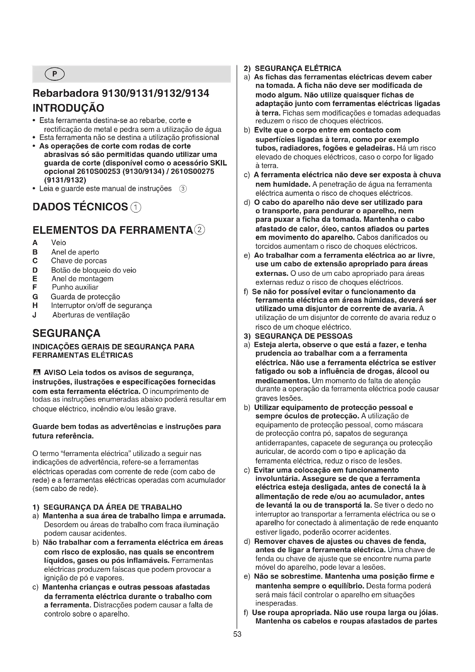 A Veio B Anel de aperto C Chave de porcas D Botão de bloqueio do veio E Anel de montagem F Punho auxiliar G Guarda de protecção H Interruptor on/o de segurança J Aberturas de ventilação SEGURANÇA INDICAÇÕES GERAIS DE SEGURANÇA PARA