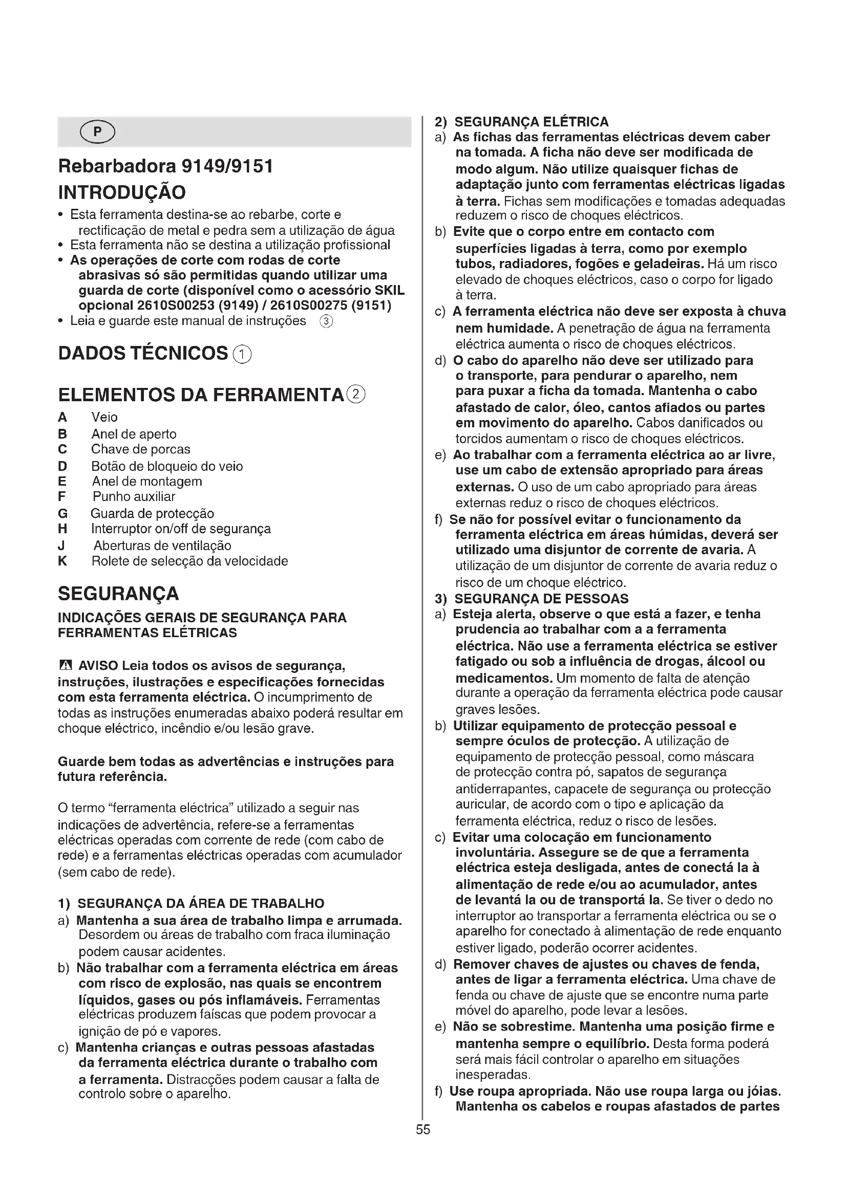 A Veio B Anel de aperto C Chave de porcas D Botão de bloqueio do veio E Anel de montagem F Punho auxiliar G Guarda de protecção H Interruptor on/o de segurança J Aberturas de ventilação K Rolete de selecção da velocidade SEGURANÇA INDICAÇÕES GERAIS DE SEGURANÇA PARA