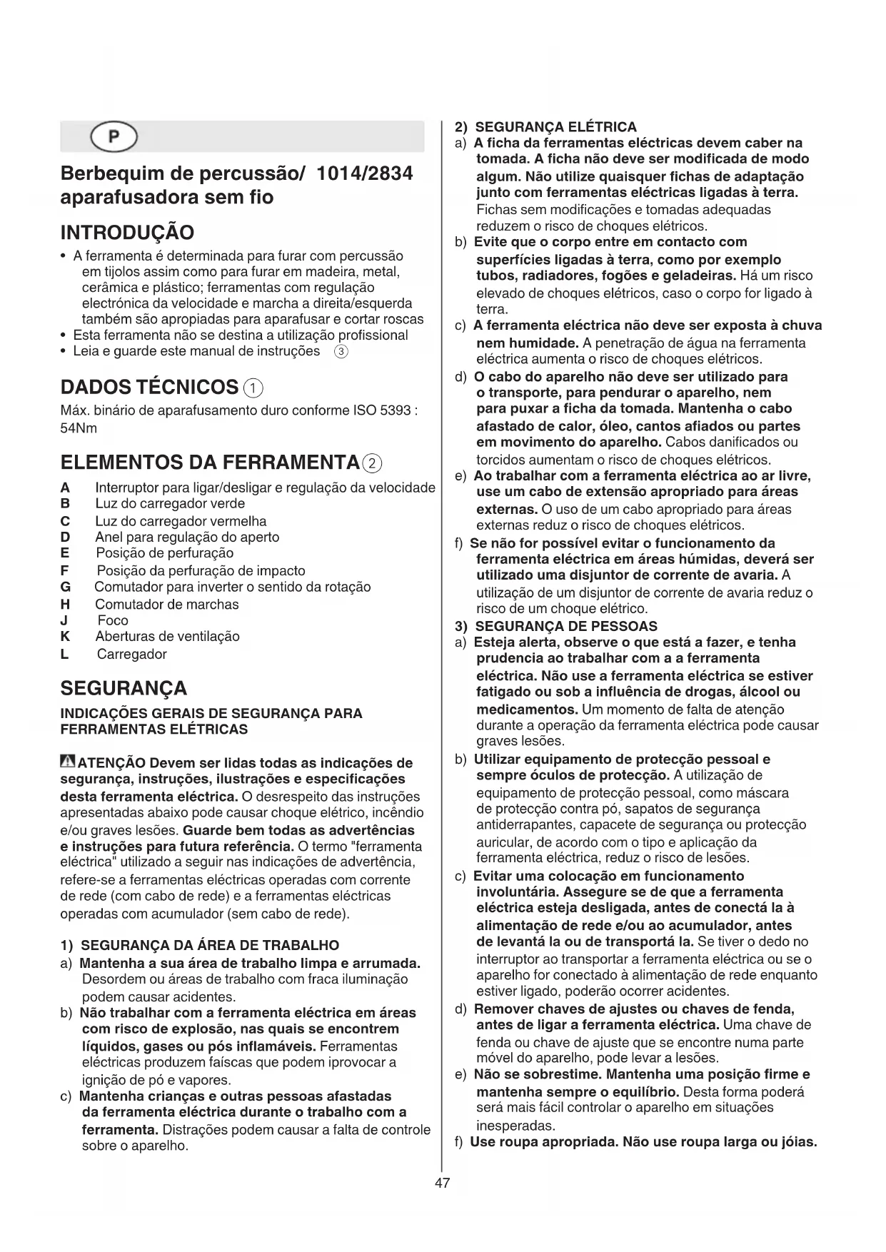 A Interruptor para ligar/desligar e regulação da velocidade B Luz do carregador verde C Luz do carregador vermelha D Anel para regulação do aperto E Posição de perfuração F Posição da perfuração de impacto G Comutador para inverter o sentido da rotação H Comutador de marchas J Foco K Aberturas de ventilação L Carregador SEGURANÇA INDICAÇÕES GERAIS DE SEGURANÇA PARA