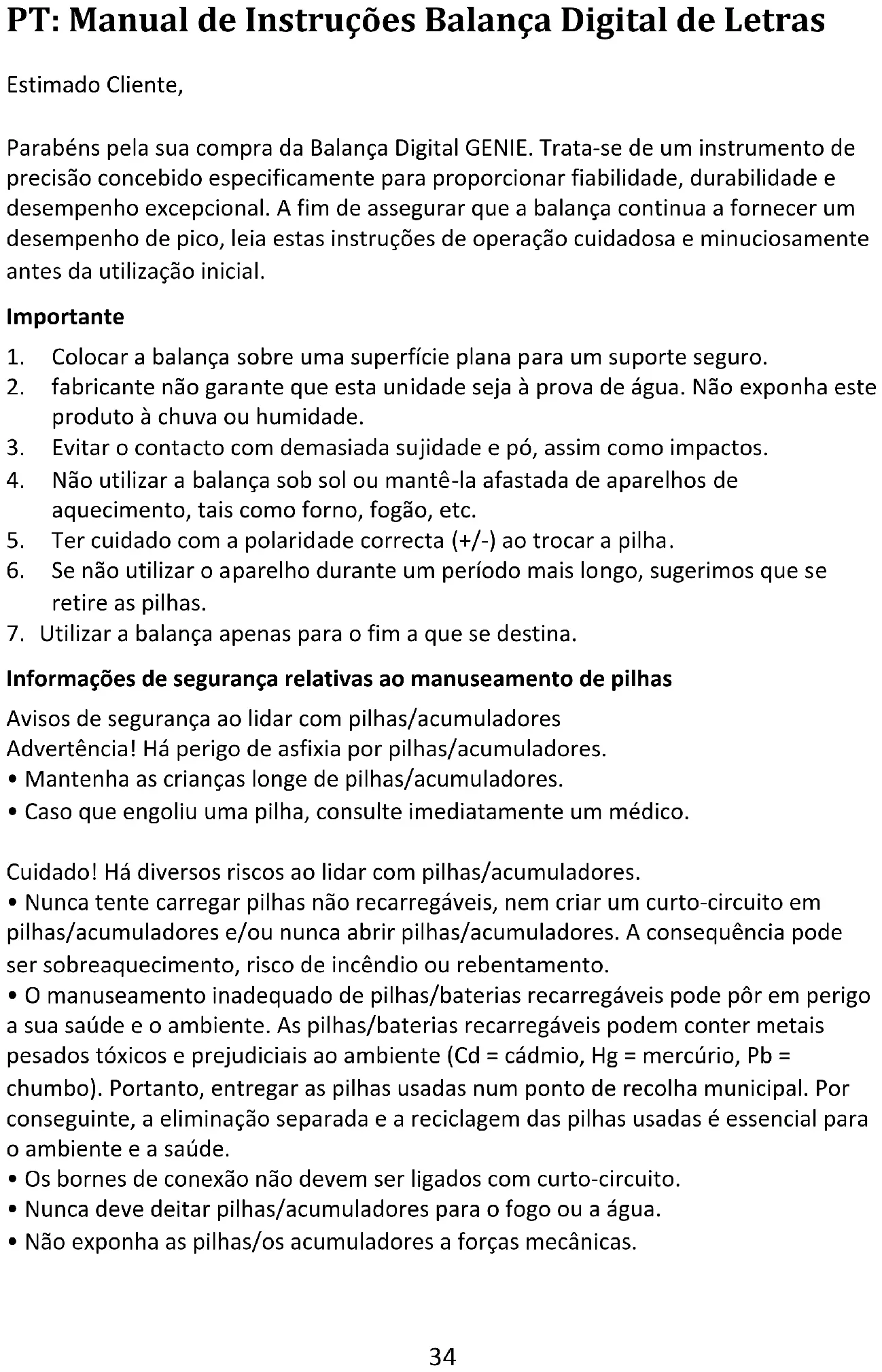 PT: Manual de Instruções Balança Digital de Letras