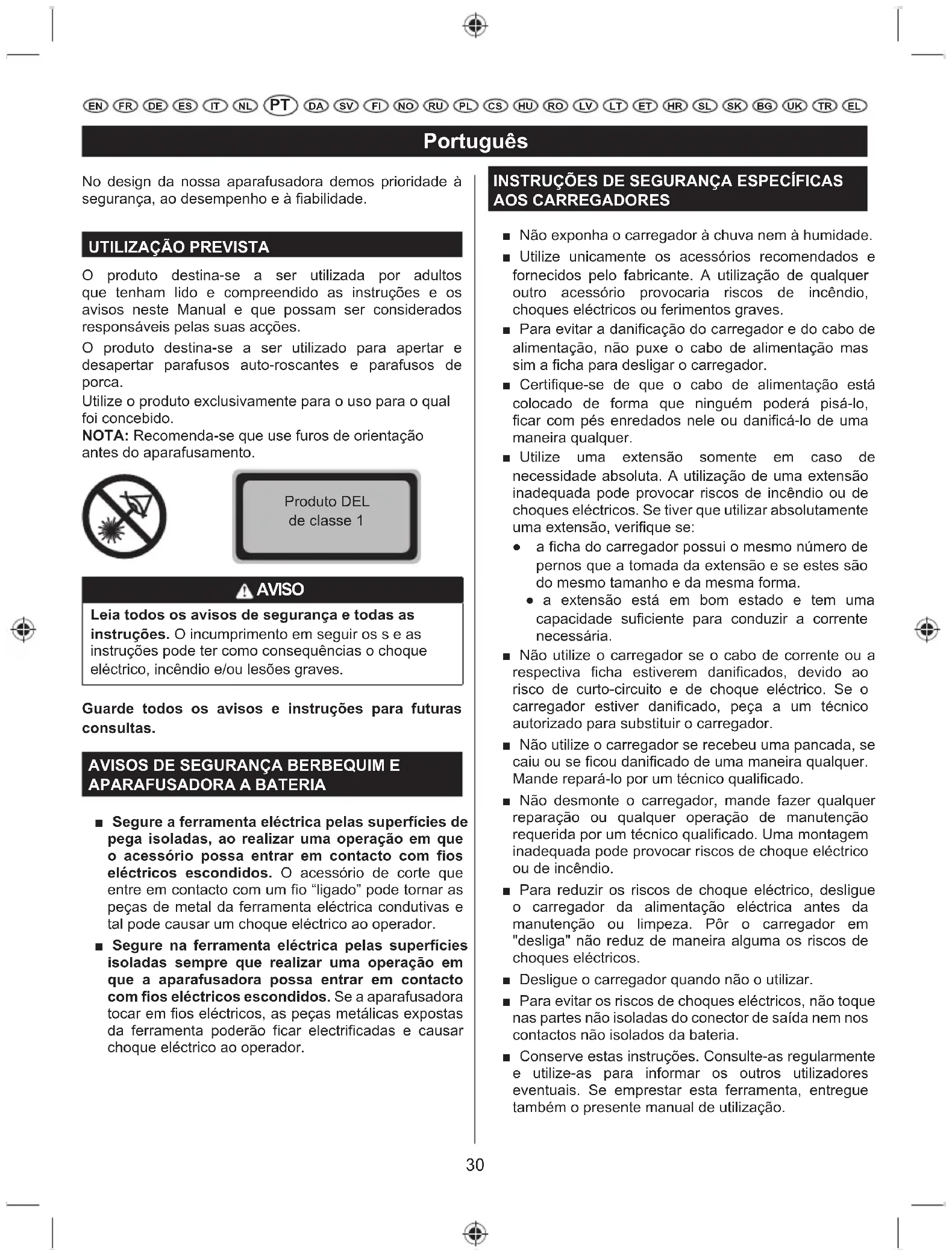 O produto destina-se a ser utilizada por adultos que tenham lido e compreendido as instruções e os avisos neste Manual e que possam ser considerados responsáveis pelas suas acções. O produto destina-se a ser utilizado para apertar e desapertar parafusos auto-roscantes e parafusos de porca. Utilize o produto exclusivamente para o uso para o qual foi concebido. NOTA: Recomenda-se que use furos de orientação antes do aparafusamento. Produto DEL de classe 1 AVISO Leia todos os avisos de segurança e todas as instruções. O incumprimento em seguir os s e as instruções pode ter como consequências o choque HOpFWULFRLQFrQGLRHRXOHV}HVJUDYHV Guarde todos os avisos e instruções para futuras consultas.