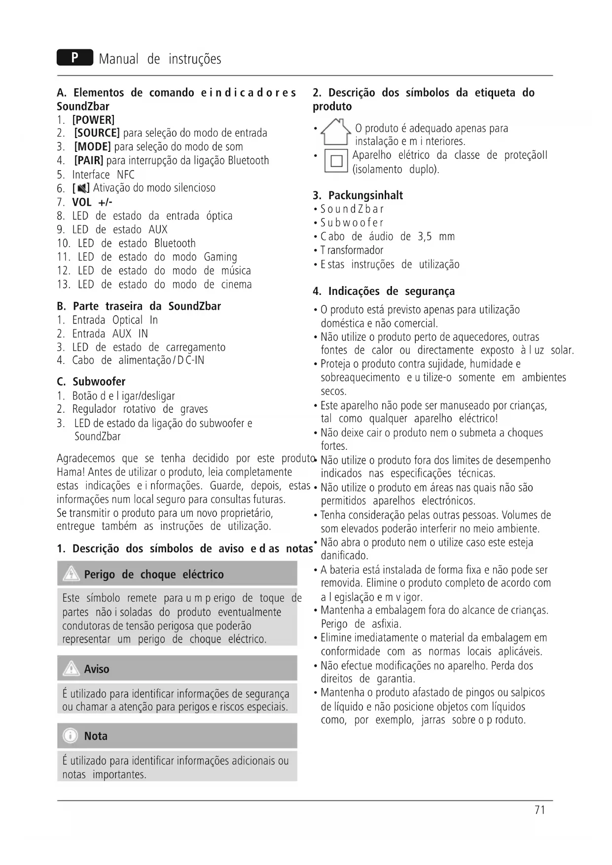 SoundZbar Agradecemos que se tenha decidido por este produto Hama! Antes de utilizar oproduto, leia completamente estas indicações einformações. Guarde, depois, estas informações num local seguroparaconsultas futuras. Se transmitir oproduto paraumnovo proprietário, entregue também as instruções de utilização.