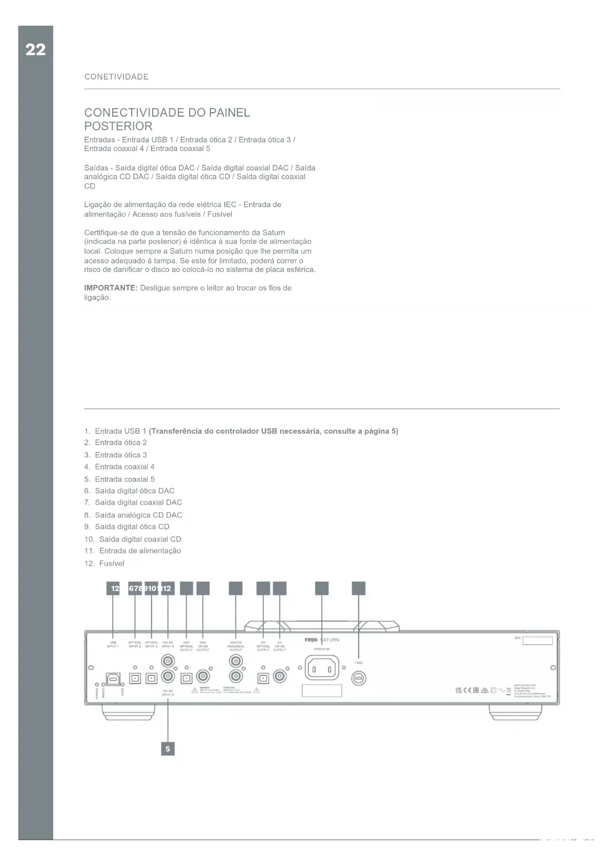 Ligação de alimentação da rede elétrica IEC - Entrada de alimentação / Acesso aos fusíveis / Fusível Certique-se de que a tensão de funcionamento da Saturn (indicada na parte posterior) é idêntica à sua fonte de alimentação local. Coloque sempre a Saturn numa posição que lhe permita um acesso adequado à tampa. Se este for limitado, poderá correr o risco de danicar o disco ao colocá-lo no sistema de placa esférica. IMPORTANTE: Desligue sempre o leitor ao trocar os os de ligação.