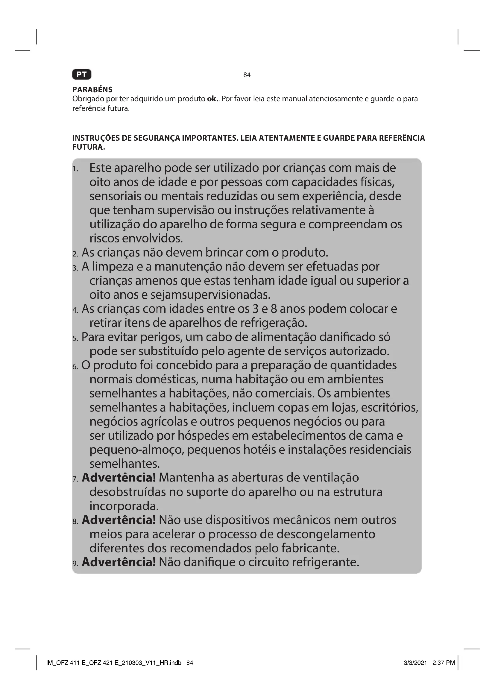 0,45kWh 183kWh Capacidade líquida do congelador : 160 litros Capacidade de congelamento : 7,20 kg/ 24 h Temperatura ambiente : 16°C - 38°C Medidas (H x W x D) : 550 X 550 X 1420 mm Profundidade com a porta aberta : 1050 mm com base na EN 62552: 2020 Este aparelho de refrigeração destina-se a ser usado a temperaturas ambientes entre 16°C e 38°C. Classe climática Temperatura ambiente N +16°C a +32 °C ST +16°C a +38 °C Use o link https://eprel.ec.europa.eu/ para aceder à base de dados europeia de produtos (EPREL), na qual são guardadas mais informações sobre o produto. Digite o identicador do modelo, que pode ser encontrado no painel do produto, assim como na etiqueta energética ou simplesmente digitalize o código QR na etiqueta energética para aceder às informações do modelo. ELIMINAÇÃO Não elimine o aparelho no lixo doméstico não separado. Retorne-o a um ponto de recolha destinado à reciclagem de lixo electrónico (WEEE). Dessa forma, estará ajudando a preservar recursos e proteger o meio ambiente. Para mais informações, entre em contacto com o seu revendedor ou asautoridades locais. Os uidos refrigerantes devem ser evacuados e eliminados por um especialista qualicado, de acordo com os regulamentos federais e locais, antes do aparelho ser eliminado. IM_OFZ 411 E_OFZ 421 E_210303_V11_HR.indb 91IM_OFZ 411 E_OFZ 421 E_210303_V11_HR.indb 91 3/3/2021 2:37 PM3/3/2021 2:37 PM92