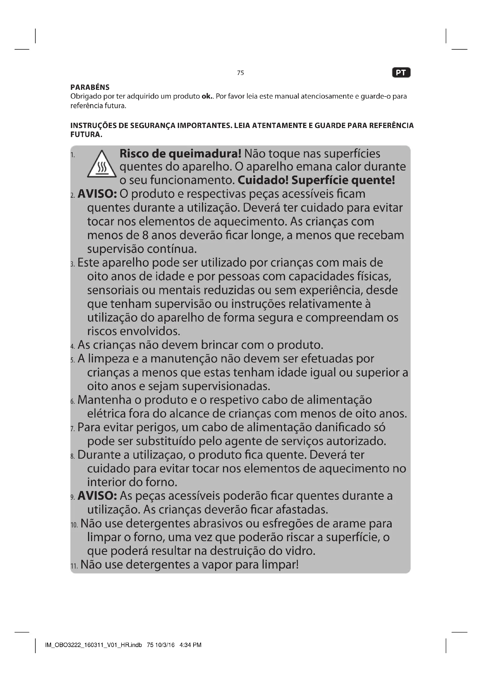 - Por favor, consulte a página de internet abaixo indicada para informações técnicas detalhadas, ou contate o fabricante para obter o documento técnico: www.ok-online.com ELIMINAÇÃO O símbolo do contentor de lixo riscado determina que os equipamentos eléctricos e electrónicos usados (WEEE) sejam recolhidos de forma separada. Tais equipamentos podem conter substâncias perigosas e prejudiciais. Não elimine o aparelho no lixo doméstico não separado. Retorne-o a um ponto de recolha destinado à reciclagem de lixo electrónico (WEEE). Dessa forma, estará ajudando a preservar recursos e proteger o meio ambiente. Para mais informações, entre em contacto com o seu revendedor ou as autoridades locais. IM_OBO3222_160311_V01_HR.indb 82 10/3/16 4:34 PM83