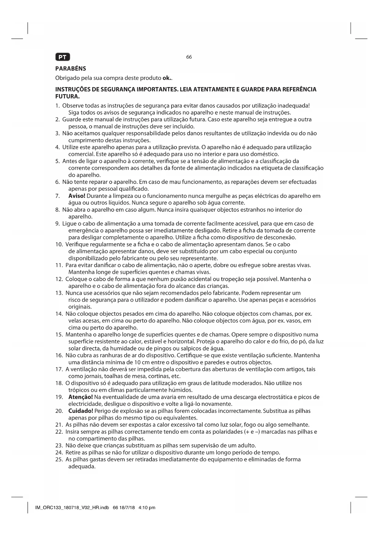 O(a) abaixo assinado(a) [Imtron GmbH] declara que o presente tipo de equipamento de rádio [ORC 130-B / ORC 133-W / ORC 133-R / ORC 133-BL / ORC 133-PK / ORC 133-GR] está em conformidade com a Diretiva 2014/53/UE. O texto integral da declaração de conformidade está disponível no seguinte endereço de Internet: http://de.ok-online.com/nc/de/suche.html ELIMINAÇÃO O logótipo do caixote do lixo com uma cruz indica a necessidade da recolha em separado do equipamento eléctrico e electrónico (WEEE). Os equipamentos eléctricos e electrónicos podem conter substâncias perigosas e prejudiciais. Não elimine este aparelho como lixo urbano indiferenciado. Entregue-o num ponto de recolha designado para a reciclagem de WEEE. Ao fazer isso, vai ajudar a conservar os recursos naturais e a proteger a natureza. Contacte o seu vendedor ou as autoridades locais para obter mais informações. Elimine as pilhas de forma ecológica. Não as jogue no lixo doméstico. Utilize os sistemas de devolução e recolha da sua zona ou contacte o vendedor onde comprou o produto. IM_ORC133_180718_V02_HR.indb 72 18/7/18 4:10 pm73