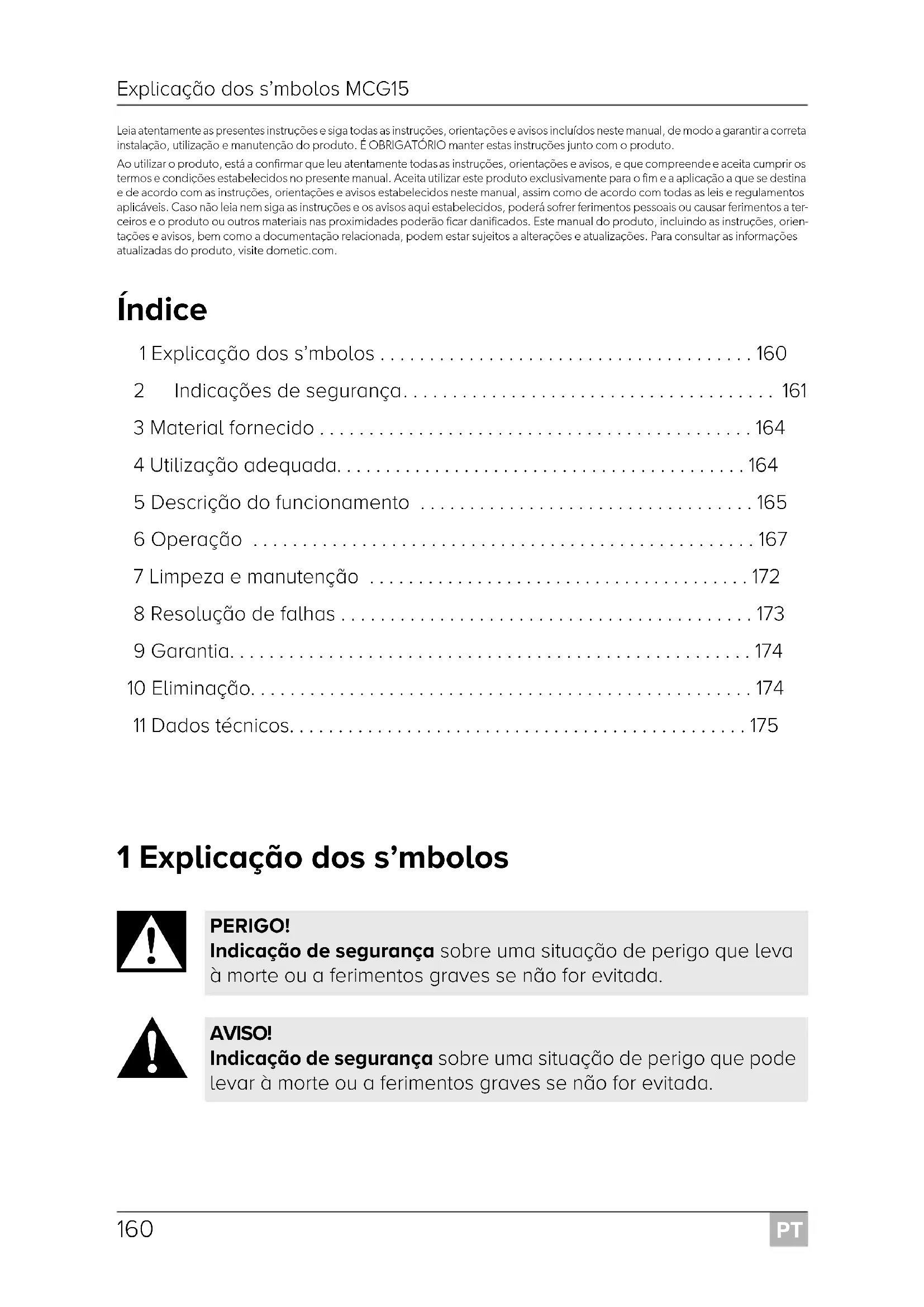 - Leia atentamente as presentes instruções e siga todas as instruções, orientações e avisos incluídos neste manual, de modo a garantir a correta instalação, utilização e manutenção do produto. É OBRIGATÓRIO manter estas instruções junto com o produto. Ao utilizar o produto, está a confirmar que leu atentamente todas as instruções, orientações e avisos, e que compreende e aceita cumprir os termos e condições estabelecidos no presente manual. Aceita utilizar este produto exclusivamente para o fim e a aplicação a que se destina e de acordo com as instruções, orientações e avisos estabelecidos neste manual, assim como de acordo com todas as leis e regulamentos aplicáveis. Caso não leia nem siga as instruções e os avisos aqui estabelecidos, poderá sofrer ferimentos pessoais ou causar ferimentos a ter- ceiros e o produto ou outros materiais nas proximidades poderão ficar danificados. Este manual do produto, incluindo as instruções, orien- tações e avisos, bem como a documentação relacionada, podem estar sujeitos a alterações e atualizações. Para consultar as informações atualizadas do produto, visite dometic.com. Índice 1 Explicação dos símbolos p. 160