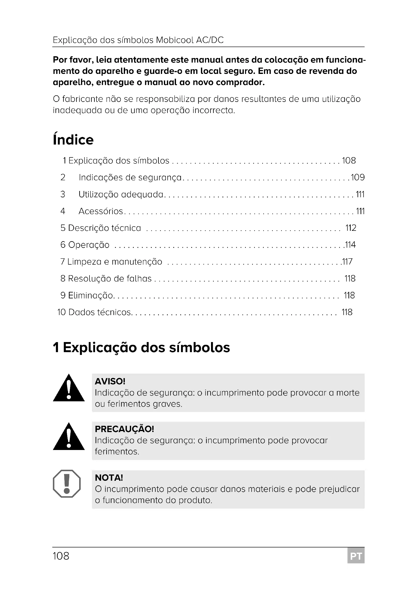 AVISO! Indicação de segurança: o incumprimento pode provocar a morte ou ferimentos graves. PRECAUÇÃO! Indicação de segurança: o incumprimento pode provocar ferimentos. NOTA! O incumprimento pode causar danos materiais e pode prejudicar o funcionamento do produto. Mobicool-AC-DC--O-16s.book Seite 108 Montag, 8. Januar 2018 6:11 18PT Mobicool AC/DC Indicações de segurança
