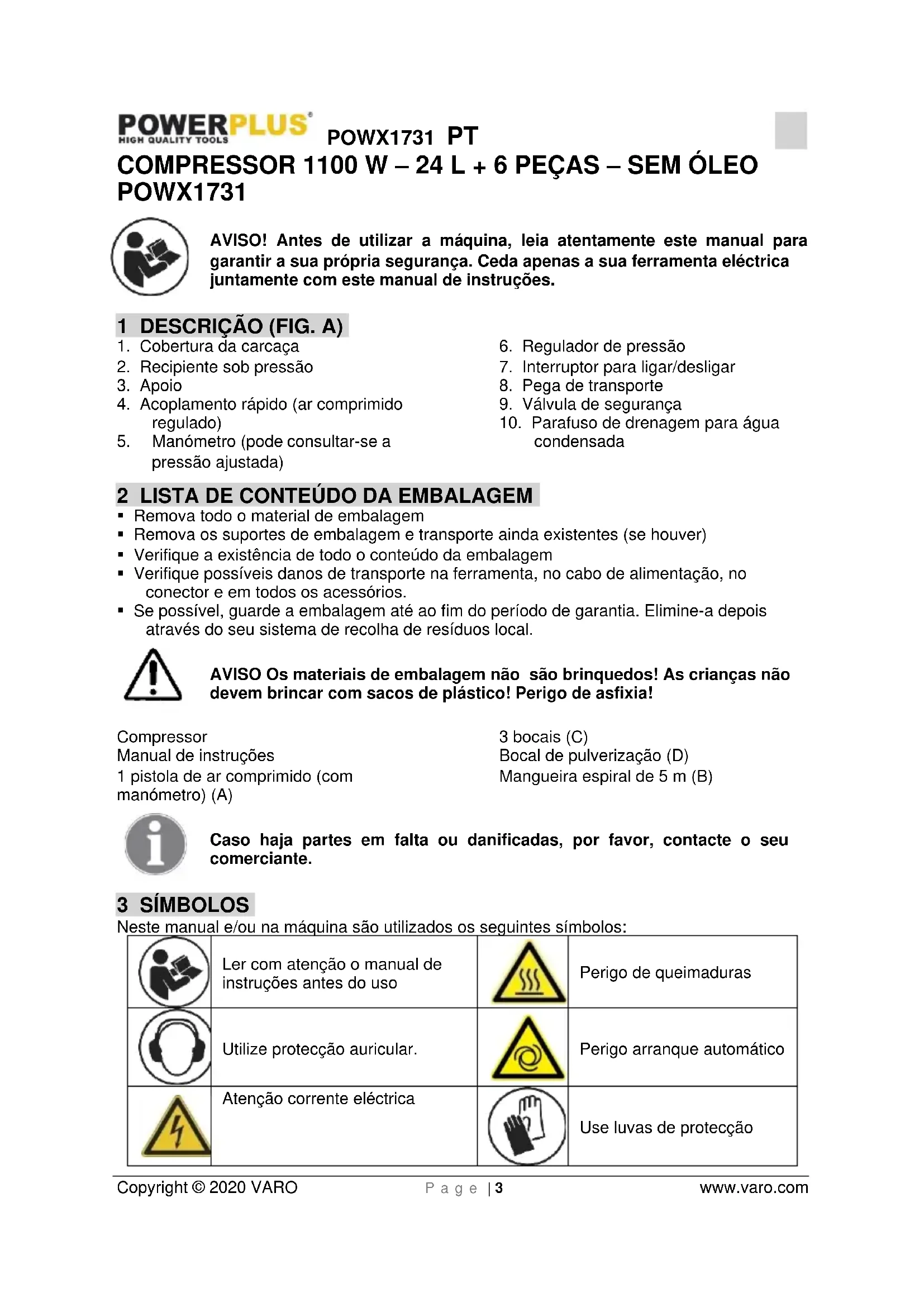 - Durante o funcionamento o compressor e os cabos atingem temperaturas elevadas. O contacto leva a queimaduras.POWX1731 PT Copyright © 2020 VARO P a g e | 6 www.varo.com