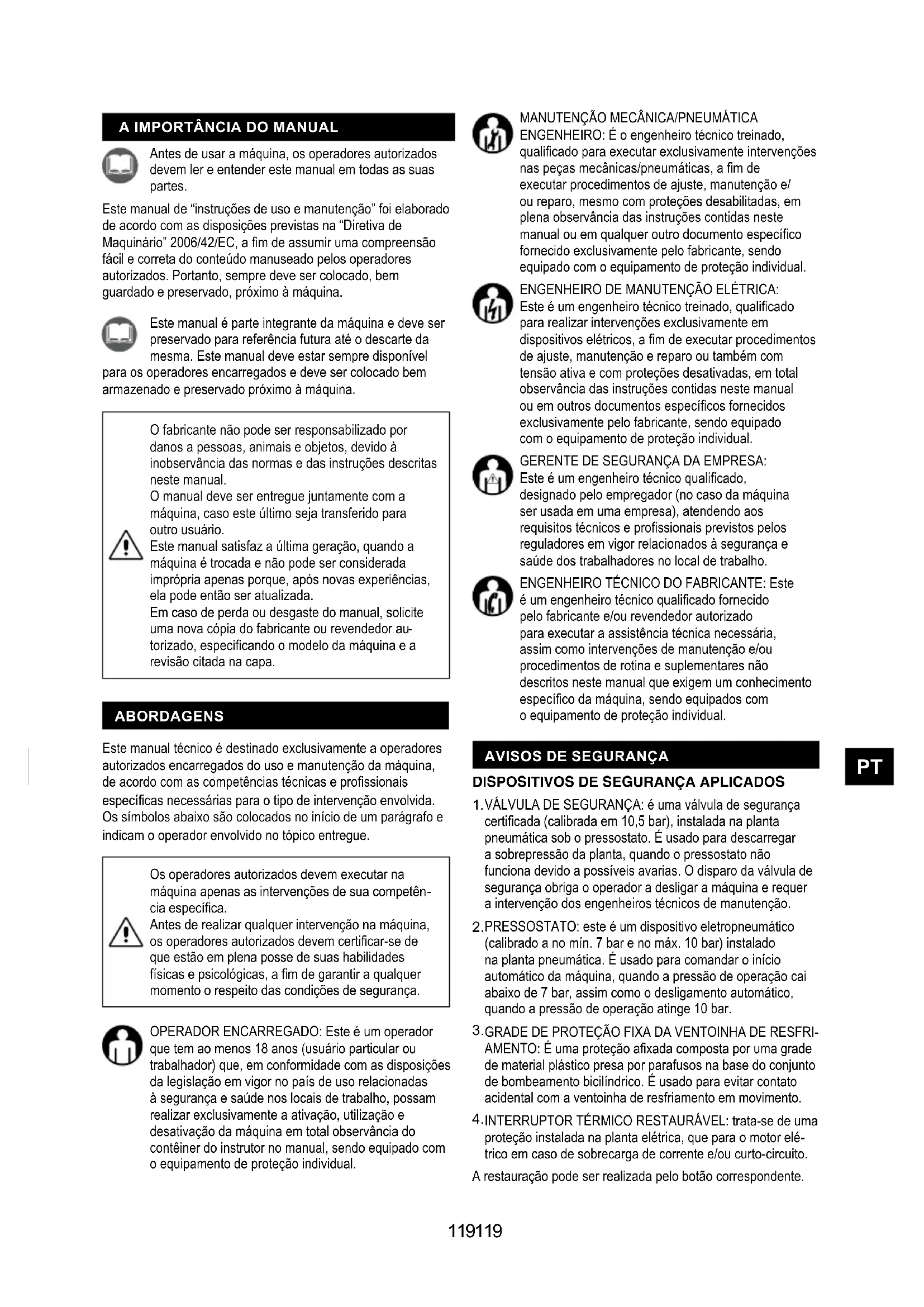 ENGENHEIRO: É o engenheiro técnico treinado, qualicado para executar exclusivamente intervenções nas peças mecânicas/pneumáticas, a m de executar procedimentos de ajuste, manutenção e/ ou reparo, mesmo com proteções desabilitadas, em plena observância das instruções contidas neste manual ou em qualquer outro documento especíco fornecido exclusivamente pelo fabricante, sendo equipado com o equipamento de proteção individual. ENGENHEIRO DE MANUTENÇÃO ELÉTRICA: Este é um engenheiro técnico treinado, qualicado para realizar intervenções exclusivamente em dispositivos elétricos, a m de executar procedimentos de ajuste, manutenção e reparo ou também com tensão ativa e com proteções desativadas, em total observância das instruções contidas neste manual ou em outros documentos especícos fornecidos exclusivamente pelo fabricante, sendo equipado com o equipamento de proteção individual. GERENTE DE SEGURANÇA DA EMPRESA: Este é um engenheiro técnico qualicado, designado pelo empregador (no caso da máquina ser usada em uma empresa), atendendo aos requisitos técnicos e prossionais previstos pelos reguladores em vigor relacionados à segurança e saúde dos trabalhadores no local de trabalho. ENGENHEIRO TÉCNICO DO FABRICANTE: Este é um engenheiro técnico qualicado fornecido pelo fabricante e/ou revendedor autorizado para executar a assistência técnica necessária, assim como intervenções de manutenção e/ou procedimentos de rotina e suplementares não descritos neste manual que exigem um conhecimento especíco da máquina, sendo equipados com o equipamento de proteção individual. Este manual é parte integrante da máquina e deve ser preservado para referência futura até o descarte da mesma. Este manual deve estar sempre disponível para os operadores encarregados e deve ser colocado bem armazenado e preservado próximo à máquina. Antes de usar a máquina, os operadores autorizados devem ler e entender este manual em todas as suas partes. Este manual de “instruções de uso e manutenção” foi elaborado de acordo com as disposições previstas na “Diretiva de Maquinário” 2006/42/EC, a m de assumir uma compreensão fácil e correta do conteúdo manuseado pelos operadores autorizados. Portanto, sempre deve ser colocado, bem guardado e preservado, próximo à máquina.