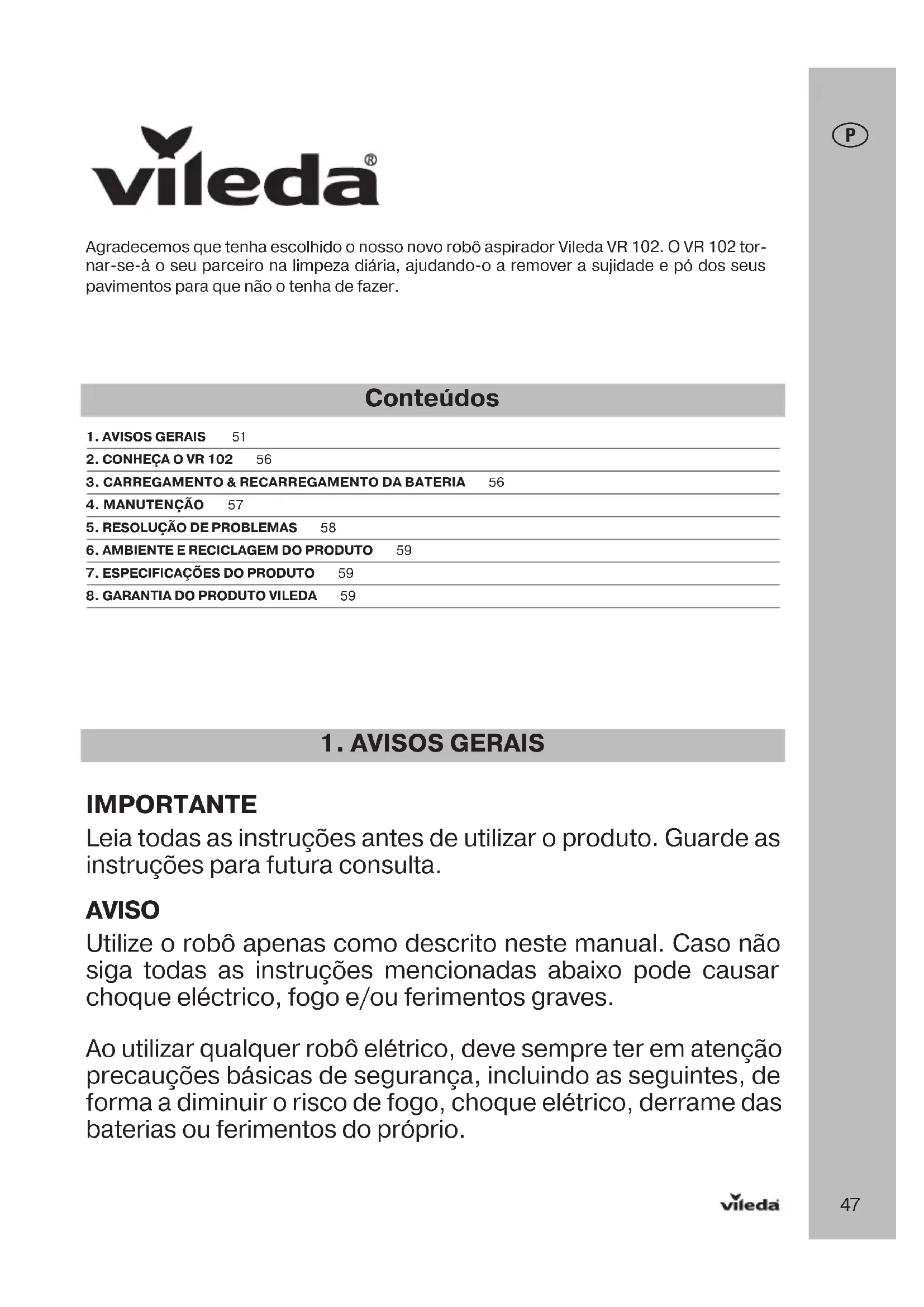 IMPORTANTE Leia todas as instruções antes de utilizar o produto. Guarde as instruções para futura consulta. AVISO Utilize o robô apenas como descrito neste manual. Caso não siga todas as instruções mencionadas abaixo pode causar choque eléctrico, fogo e/ou ferimentos graves. Ao utilizar qualquer robô elétrico, deve sempre ter em atenção precauções básicas de segurança, incluindo as seguintes, de forma a diminuir o risco de fogo, choque elétrico, derrame das baterias ou ferimentos do próprio. Agradecemos que tenha escolhido o nosso novo robô aspirador Vileda VR 102. O VR 102 tor- nar-se-à o seu parceiro na limpeza diária, ajudando-o a remover a sujidade e pó dos seus pavimentos para que não o tenha de fazer. Conteúdos 1. AVISOS GERAIS 512. CONHEÇA O VR 102 563. CARREGAMENTO & RECARREGAMENTO DA BATERIA 564. MANUTENÇÃO 575. RESOLUÇÃO DE PROBLEMAS 586. AMBIENTE E RECICLAGEM DO PRODUTO 597. ESPECIFICAÇÕES DO PRODUTO 598. GARANTIA DO PRODUTO VILEDA 5948