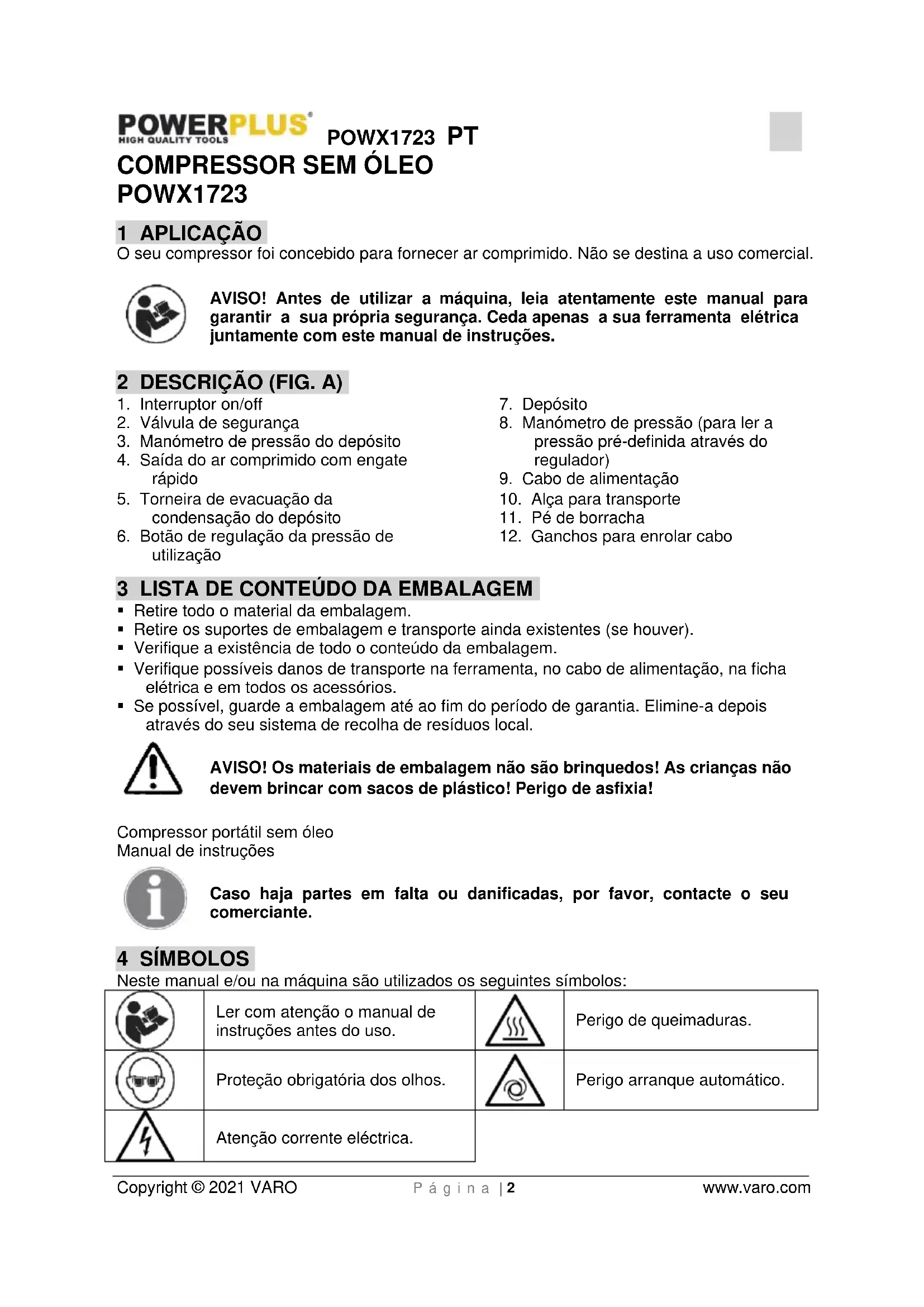 Este símbolo indica as advertências a ler com atenção antes de utilizar o produto, de forma a prevenir possíveis danos físicos ao utilizador. O ar comprimido é uma forma de energia potencialmente perigosa; portanto, é necessário ter o máximo cuidado ao utilizar o compressor e os acessórios.POWX1723 PT Copyright © 2021 VARO P á g i n a | 5 www.varo.com Atenção: o compressor pode voltar a funcionar em caso de queda de energia e restabelecimento subsequente da tensão. O valor de PRESSÃO ACÚSTICA medindo 4 m. equivale ao valor de POTÊNCIA ACÚSTICA declarado na etiqueta amarela, posicionada no compressor, menos 20 dB.