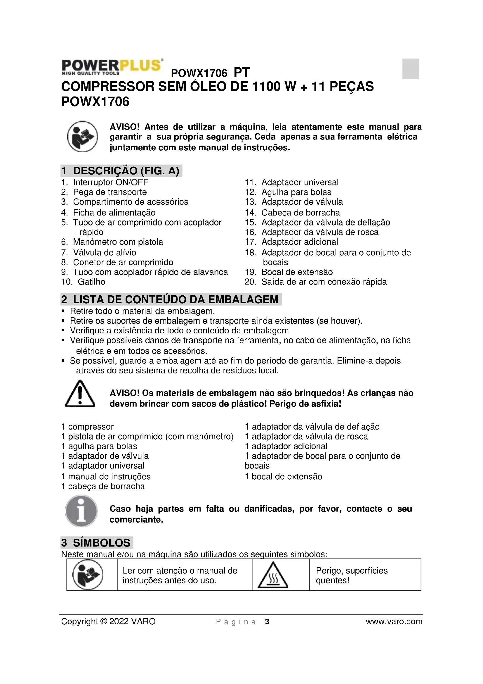 Copyright © 2022 VARO P á g i n a | 3 www.varo.com COMPRESSOR SEM ÓLEO DE 1100 W + 11 PEÇAS POWX1706 AVISO! Antes de utilizar a máquina, leia atentamente este manual para garantir a sua própria segurança. Ceda apenas a sua ferramenta elétrica juntamente com este manual de instruções. 1 DESCRIÇÃO (FIG. A)