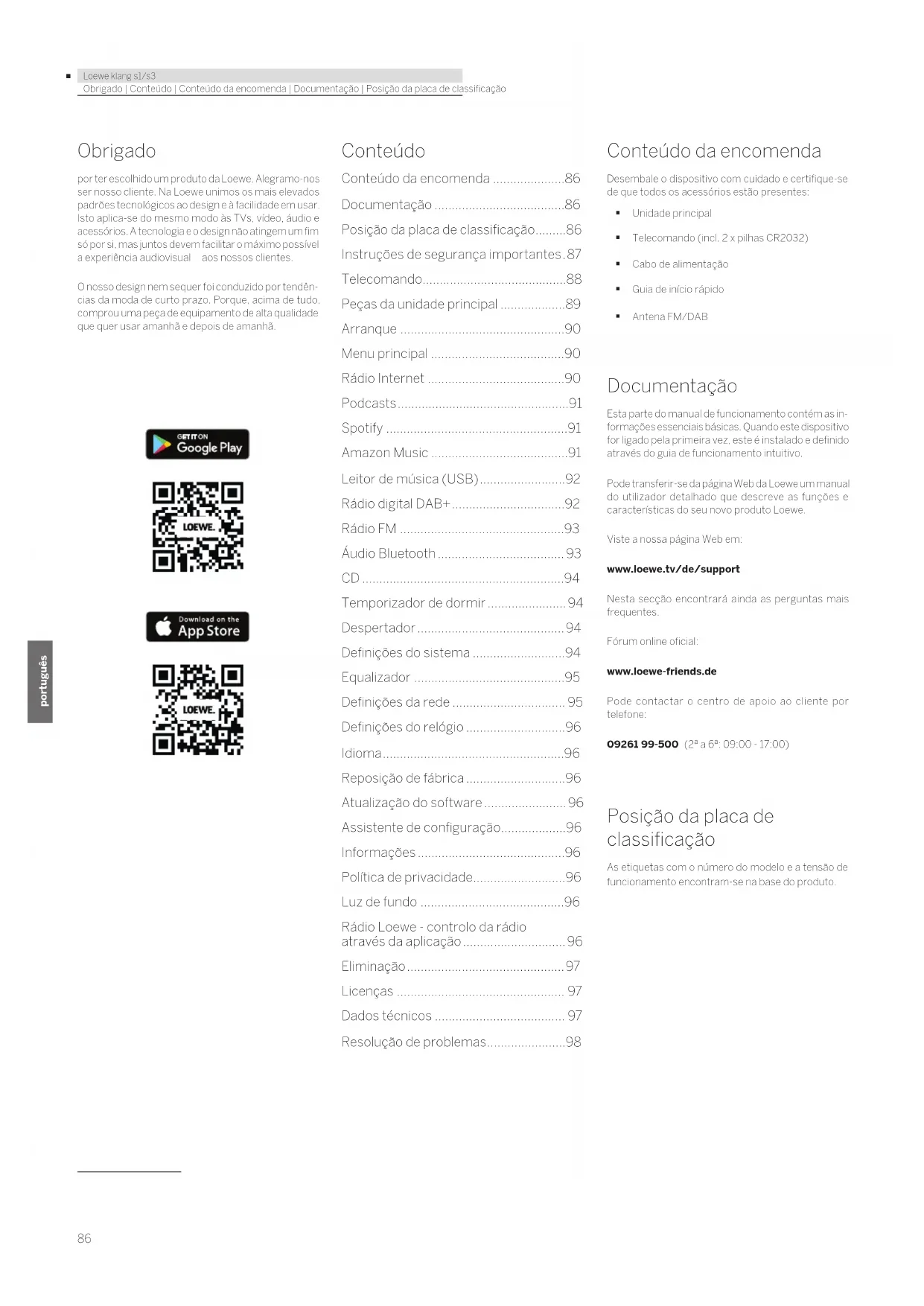 - Loewe klang s1/s3 deutsch português Obrigado | Conteúdo | Conteúdo da encomenda | Documentação | Posição da placa de classicação Obrigado por ter escolhido um produto da Loewe. Alegramo-nos ser nosso cliente. Na Loewe unimos os mais elevados padrões tecnológicos ao design e à facilidade em usar. Isto aplica-se do mesmo modo às TVs, vídeo, áudio e acessórios. A tecnologia e o design não atingem um fim só por si, mas juntos devem facilitar o máximo possível a experiência audiovisual aos nossos clientes. O nosso design nem sequer foi conduzido por tendên- cias da moda de curto prazo. Porque, acima de tudo, comprou uma peça de equipamento de alta qualidade que quer usar amanhã e depois de amanhã. Conteúdo Conteúdo da encomenda p. 86
