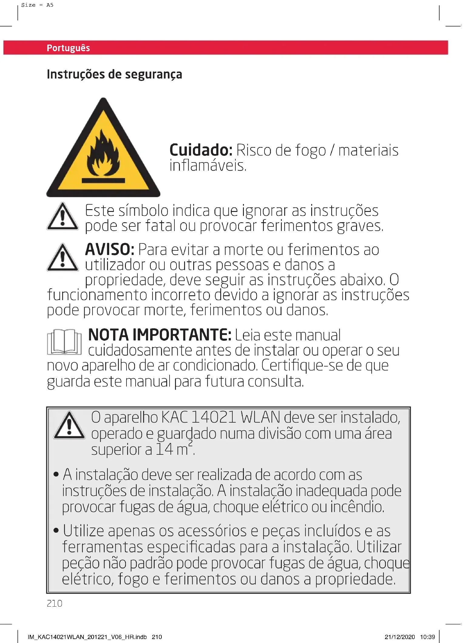 Size = A5 Instruções de segurança Cuidado: Risco de fogo / materiais inflamáveis. Este símbolo indica que ignorar as instruções pode ser fatal ou provocar ferimentos graves. AVISO: Para evitar a morte ou ferimentos ao utilizador ou outras pessoas e danos a propriedade, deve seguir as instruções abaixo. O funcionamento incorreto devido a ignorar as instruções pode provocar morte, ferimentos ou danos. NOTA IMPORTANTE: Leia este manual cuidadosamente antes de instalar ou operar o seu novo aparelho de ar condicionado. Certifique-se de que guarda este manual para futura consulta. O aparelho KAC 14021 WLAN deve ser instalado, operado e guardado numa divisão com uma área superior a 14m².