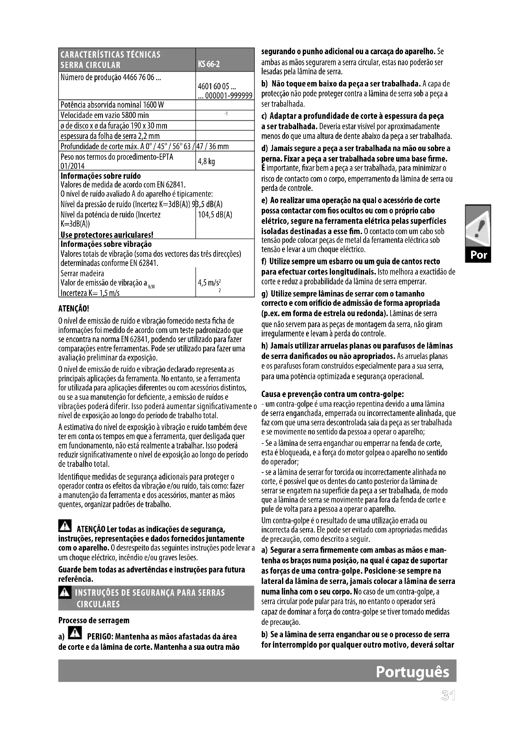 ATENÇÃO! O nível de emissão de ruído e vibração fornecido nesta cha de informações foi medido de acordo com um teste padronizado que se encontra na norma EN 62841, podendo ser utilizado para fazer comparações entre ferramentas. Pode ser utilizado para fazer uma avaliação preliminar da exposição. O nível de emissão de ruído e vibração declarado representa as principais aplicações da ferramenta. No entanto, se a ferramenta for utilizada para aplicações diferentes ou com acessórios distintos, ou se a sua manutenção for deciente, a emissão de ruídos e vibrações poderá diferir. Isso poderá aumentar signicativamente o nível de exposição ao longo do período de trabalho total. A estimativa do nível de exposição à vibração e ruído também deve ter em conta os tempos em que a ferramenta, quer desligada quer em funcionamento, não está realmente a trabalhar. Isso poderá reduzir signicativamente o nível de exposição ao longo do período de trabalho total. Identique medidas de segurança adicionais para proteger o operador contra os efeitos da vibração e/ou ruído, tais como: fazer a manutenção da ferramenta e dos acessórios, manter as mãos quentes, organizar padrões de trabalho. ATENÇÃO Ler todas as indicações de segurança, instruções, representações e dados fornecidos juntamente com o aparelho. O desrespeito das seguintes instruções pode levar a um choque eléctrico, incêndio e/ou graves lesões. Guarde bem todas as advertências e instruções para futura referência. INSTRUÇÕES DE SEGURANÇA PARA SERRAS CIRCULARES Processo de serragem