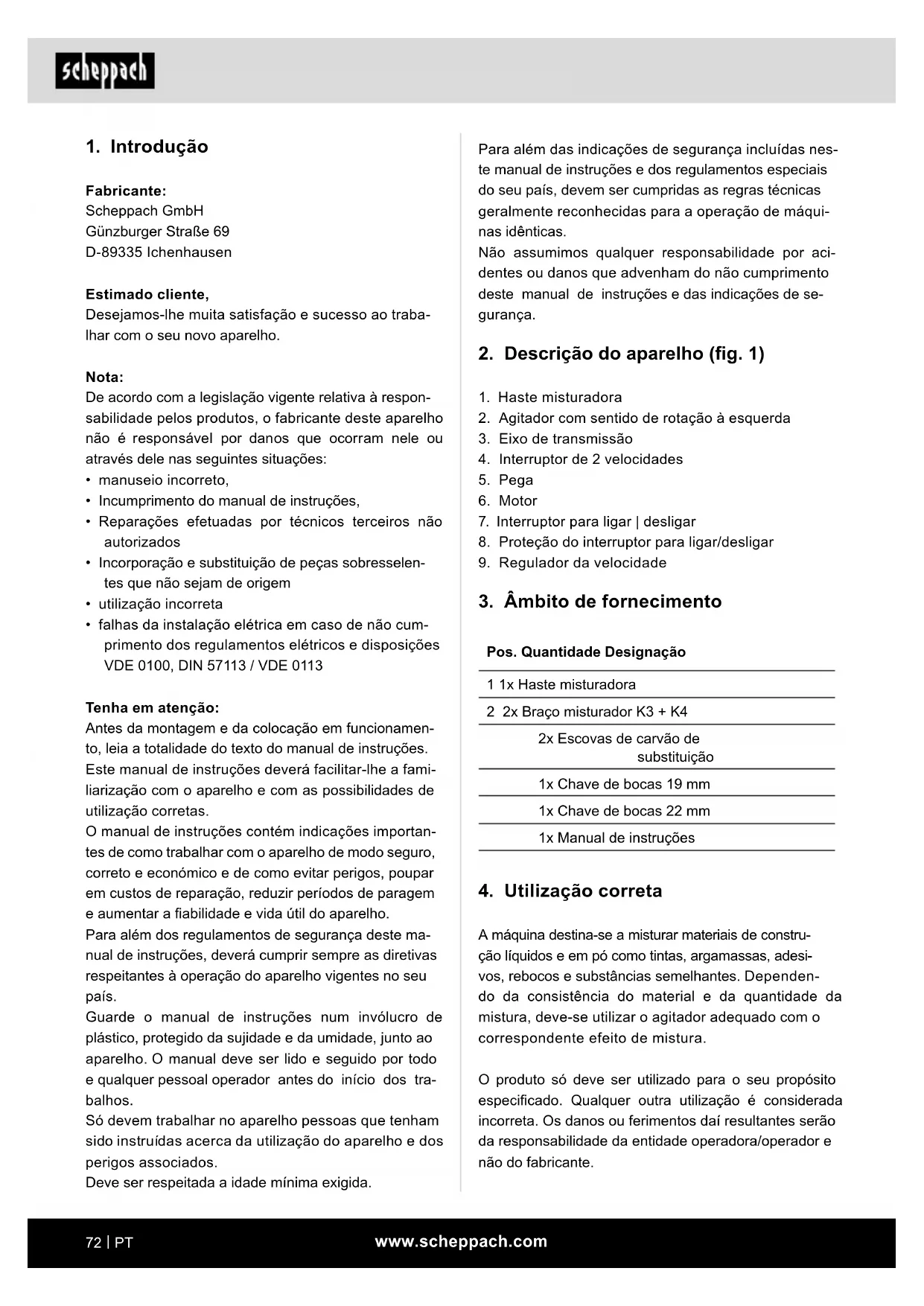 Tenha em atenção: Antes da montagem e da colocação em funcionamen- to, leia a totalidade do texto do manual de instruções. Este manual de instruções deverá facilitar-lhe a fami- liarização com o aparelho e com as possibilidades de utilização corretas. O manual de instruções contém indicações importan- tes de como trabalhar com o aparelho de modo seguro, correto e económico e de como evitar perigos, poupar em custos de reparação, reduzir períodos de paragem e aumentar a abilidade e vida útil do aparelho. Para além dos regulamentos de segurança deste ma- nual de instruções, deverá cumprir sempre as diretivas respeitantes à operação do aparelho vigentes no seu país. Guarde o manual de instruções num invólucro de plástico, protegido da sujidade e da umidade, junto ao aparelho. O manual deve ser lido e seguido por todo e qualquer pessoal operador antes do início dos tra- balhos. Só devem trabalhar no aparelho pessoas que tenham sido instruídas acerca da utilização do aparelho e dos perigos associados. Deve ser respeitada a idade mínima exigida.www.scheppach.com