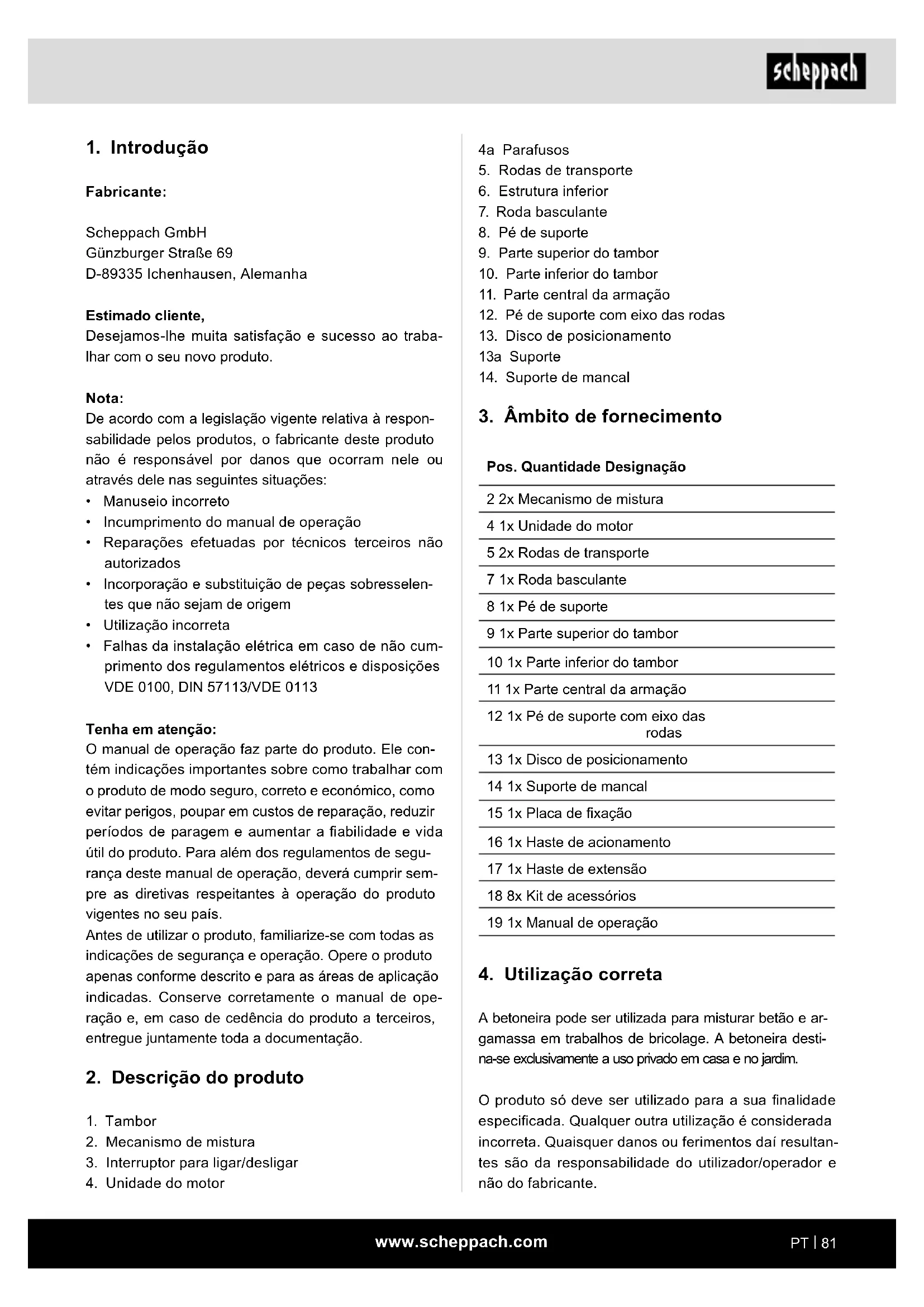 - Nunca coloque as mãos em peças rotativas da má- quina quando esta estiver em funcionamento. Existe perigo de captura/enrolamento por parte do tambor em rotação ou das ferramentas de mistura em ro- tação. Faz igualmente parte da utilização correta o cumpri- mento das indicações de segurança, assim como das instruções de montagem e das indicações de opera- ção no manual de instruções. As pessoas responsáveis pela operação e manutenção da ferramenta deverão estar familiarizadas com a mes- ma e ser instruídas relativamente aos possíveis perigos. Qualquer alteração no produto isenta o fabricante de toda e qualquer responsabilidade por danos daí resul- tantes. O produto só pode ser operado com peças e acessó- rios originais do fabricante. As instruções de segurança e de manutenção, os pro- cedimentos de trabalho do fabricante, bem como as dimensões constantes nos Dados Técnicos devem ser observados. Tenha em atenção que os nossos produtos não foram construídos para utilização em ambientes comerciais, artesanais ou industriais. Não assumimos qualquer garantia, se o produto for utilizado em ambientes co- merciais, artesanais, industriais ou equivalentes. O fabricante não se responsabiliza por danos causa- dos pela utilização indevida ou operação incorreta. Explicação das palavras de sinalização no manual de instruções m PERIGO Palavra de sinalização para identicar uma situação iminentemente perigosa que, se não for evitada, resultará em morte ou ferimentos graves. m CUIDADO Palavra de sinalização para identicar uma situação potencialmente perigosa que, se não for evitada, poderá resultar em ferimentos menores ou moderados. ATENÇÃO Palavra de sinalização para identicar uma situação potencialmente perigosa que, se não for evitada, poderá resultar em danos materiais ao produto ou património/propriedade.www.scheppach.com