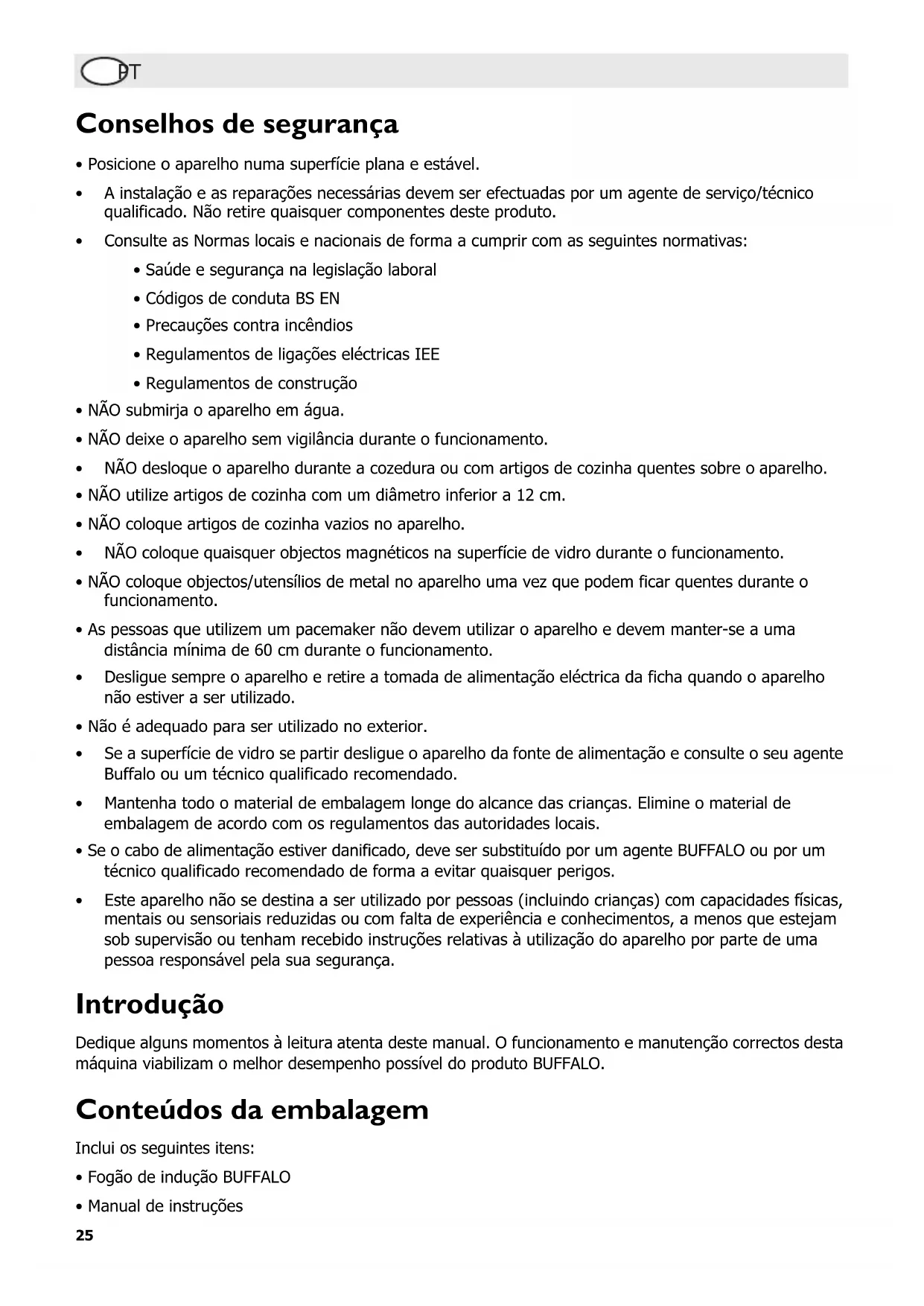 - No caso de ser necessário proceder a reparações no aparelho, as mesmas devem ser efectuadas por um revendedor ou técnico qualificado da BUFFALO. Resolução de problemas Se o aparelho BUFFALO apresentar uma falha, verifique a seguinte tabela antes de entrar em contacto com a Linha de assistência. Especificações técnicas Mensagem de erro Causa Solução Sonora - beep Não foi colocado um recipiente para cozinhar ou não adequado á indução. Use um recipiente adequado á indução como a linha Vogue de aço inoxidável. E01 O equipamento está super aquecido Verifique se o filtro do ventilador (localizado na parte debaixo do producto) está limpo e desobstruído. Deixe-o esfriar. Se o código de erro persistir mesmo depois de resfriado, contacte um agente Buffalo. E02 Recipiente aquecido está vazio ou a sua temperatura é muito alta Remova o recipiente da placa. Deixe-o esfriar. Verifique se o recipiente contém produtos a serem aquecidos. Se o código de erro persistir mesmo depois de resfriado, contacte um agente Buffalo. E03 A potência aumentou acima dos limites normais de funcionamento. Desligue o produto. Deixe-o esfriar. Se o código de erro persistir mesmo depois de resfriado, contacte um agente Buffalo. Modelo Tensão Potência (máx.) Corrente Intervalo de potência Dimensões (A x L x P) mm Peso (kg) CE208 230V 50Hz 3000W 13A 500 - 3000W 85 x 386 x 328 6.528 UKPT Número da Linha de assistência: 0845 146 2887 (Reino Unido) Ligações eléctricas Este aparelho é fornecido som uma tomada e cabo BS1363 moldados de 3 pinos e um fusível de 13 amperes se série. A tomada deve ser ligada a uma fonte de alimentação eléctrica adequada. As ligações eléctricas deste aparelho são as seguintes: