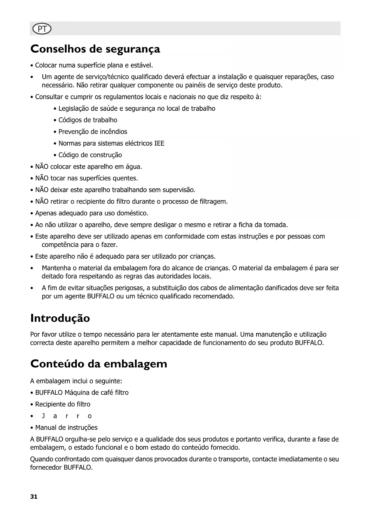 Nota: Utilize o jarro para encher o depósito e de modo a não exceder a capacidade máxima do depósito. O depósito de água tem uma capacidade máxima de 2,2 litros. Nota: durante este processo de lavagem a máquina pode produzir vapor e fazer barulhos. Isto é perfeitamente normal. AVISO: durante o funcionamento da máquina o jarro pode ficar muito quente. Pegue sempre o jarro pela asa a fim de evitar ferimentos. Nota: utilizar um produto descalcificante adequado e seguir as instruções na embalagem. Nota: a BUFFALO aconselha intervalos de descalcificação da máquina de 3 meses e para lugares com água dura intervalos mais curtos.34