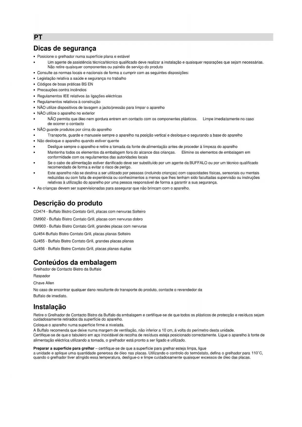 - As crianças devem ser supervisionadas para assegurar que não brincam com o aparelho. Descrição do produto CD474 - Buffalo Bistro Contato Grill, placas com nervuras Solteiro DM902 - Buffalo Bistro Contato Grill, placas com nervuras dobro DM903 - Buffalo Bistro Contato Grill, grandes placas com nervuras GJ454-Buffalo Bistro Contato Grill, placas planas Solteiro GJ455 - Buffalo Bistro Contato Grill, grandes placas planas GJ456 - Buffalo Bistro Contato Grill, placas planas duplas Conteúdos da embalagem Grelhador de Contacto Bistro da Buffalo Raspador Chave Allen No caso de encontrar qualquer dano resultante do transporte do produto, contacte o revendedor da Buffalo de imediato. Instalação Retire o Grelhador de Contacto Bistro da Buffalo da embalagem e certifique-se de que todos os plásticos de protecção e resíduos sejam cuidadosamente retirados da superfície do aparelho. Coloque o aparelho numa superfície firme e nivelada. A Buffalo recomenda que deixe numa margem de ventilação, não inferior a 10 cm, à volta do perímetro desta unidade. Certifique-se de que o tabuleiro em aço inoxidável de recolha de resíduos esteja posicionado correctamente. Ligue o aparelho à fonte de alimentação eléctrica utilizando a tomada, o grelhador está pronto a ser ligado e utilizado. Preparar a superfície para grelhar – certifique-se de que a superfície para grelhar esteja limpa, ligue a unidade e aplique uma quantidade generosa de óleo nas placas. Utilizando o controlo do termóstato, defina o grelhador para 110˚C, quando o grelhador tiver atingido essa temperatura, desligue-o e limpe cuidadosamente quaisquer excessos de óleo das placas.Número da Linha de assistência: 800 83 42 44 PT Funcionamento O Grelhador de Contacto deve ser ligado pelo menos 5 minutos antes de ser utilizado. Para uma utilização mais eficaz desta unidade quando estiver a ser utilizada de forma intermitente, é recomendado que as placas do grelhador permaneçam fechadas e que o termóstato esteja desligado quando o aparelho não estiver a grelhar alimentos. Este procedimento contribui para uma diminuição no consumo de energia assim como para uma resposta de temperatura mais rápida quando necessário. A Buffalo recomenda que a superfície para grelhar esteja ligeiramente untada antes de cada utilização. Uma definição de temperatura entre 200° C e 220° C é, de forma geral, suficiente para grelhar. Esta definição pode variar para determinados tipos de alimentos, necessidades ou experiências individuais. Coloque simplesmente os alimentos na superfície para grelhar inferior, desça a placa superior e grelhe conforme o seu gosto. Utilize a chave Allen fornecida para ajustar a pressão da placa superior. Rode para a direita para apertar e para a esquerda para desapertar.